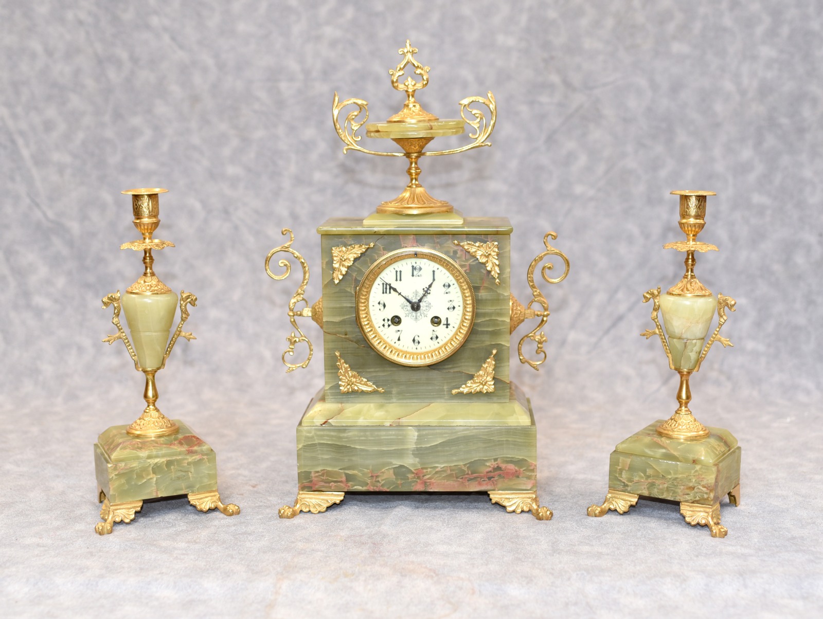French Empire Antique Onyx Mantle Clock Gilt Garniture Set