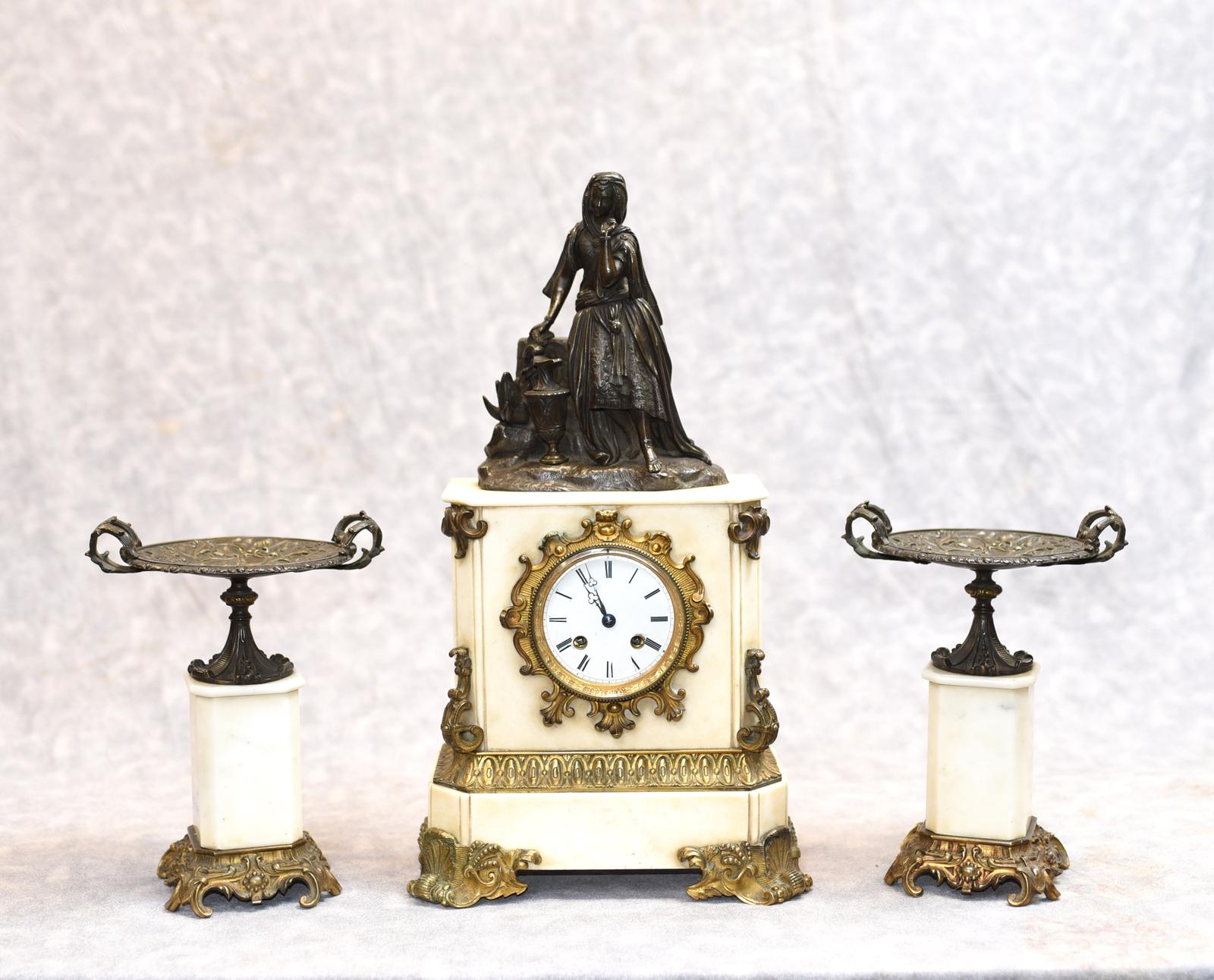 French Empire Marble Ormolu Mantle Clock Set Bronze Figurine