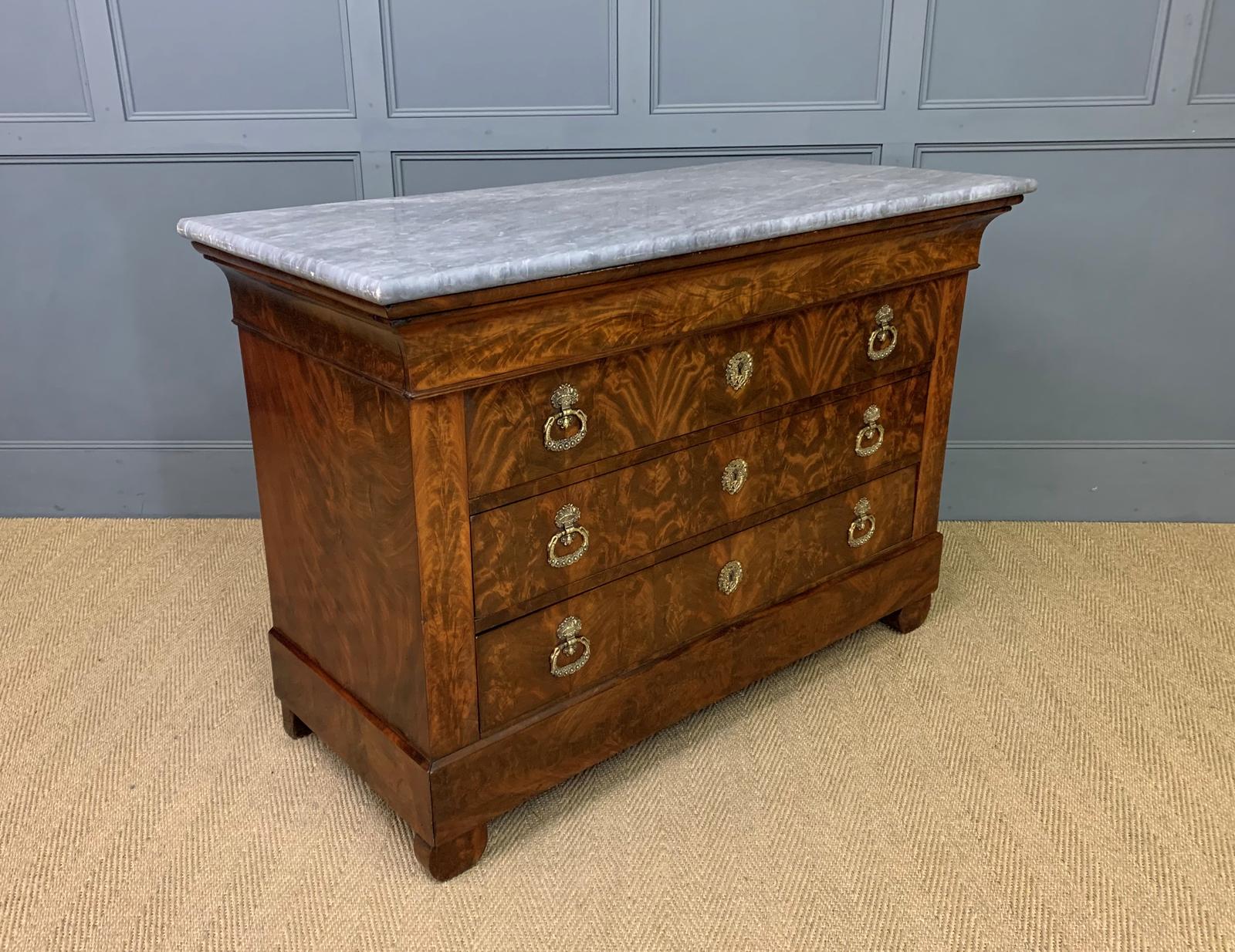 French Flame Mahogany Louis Philippe Marble Topped Commode