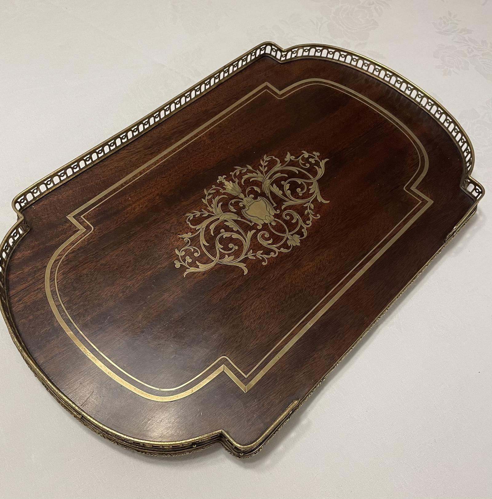 A quality French serving tray in mahogany with brass gallery and brass inlay.