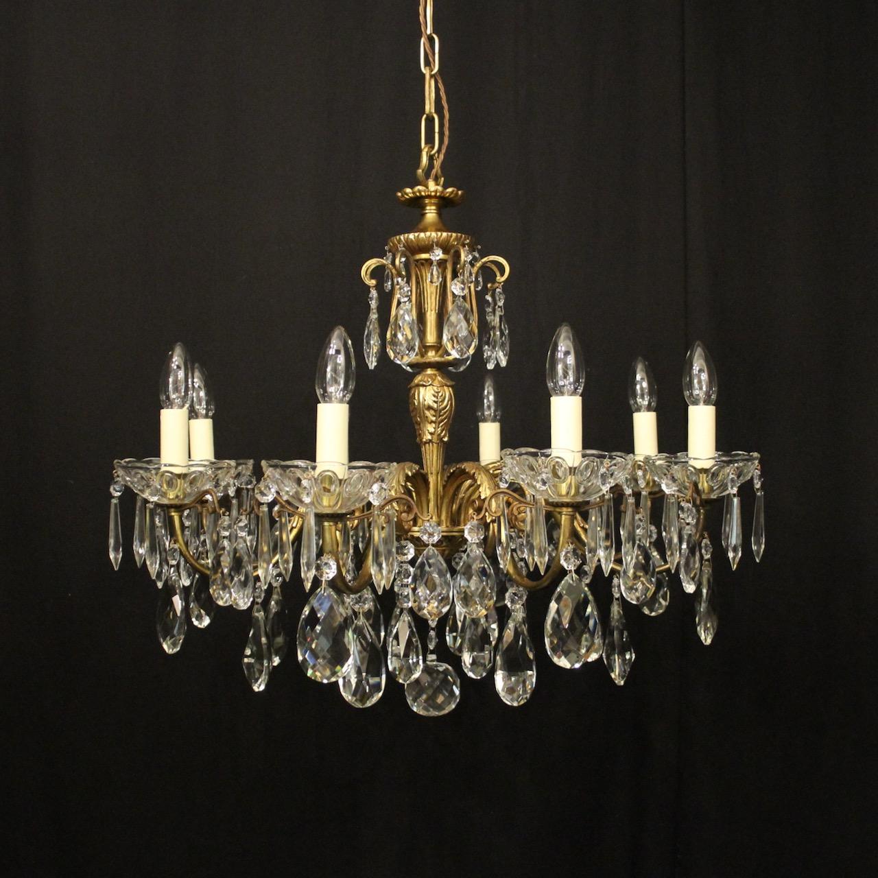 A French gilded bronze and crystal 8 light antique chandelier, the leaf scrolling arms with glass bobeche drip pans and candle sconces, issuing from a foliated leaf tapering central column with scrolling canopy, decorated overall in faceted crystal pendants and having the original chain and ceiling rose. Lovely original crisp gilded patination and good wide proportions. Fully rewired and PAT tested. All our chandeliers come with ceiling fixings and spare bulbs.