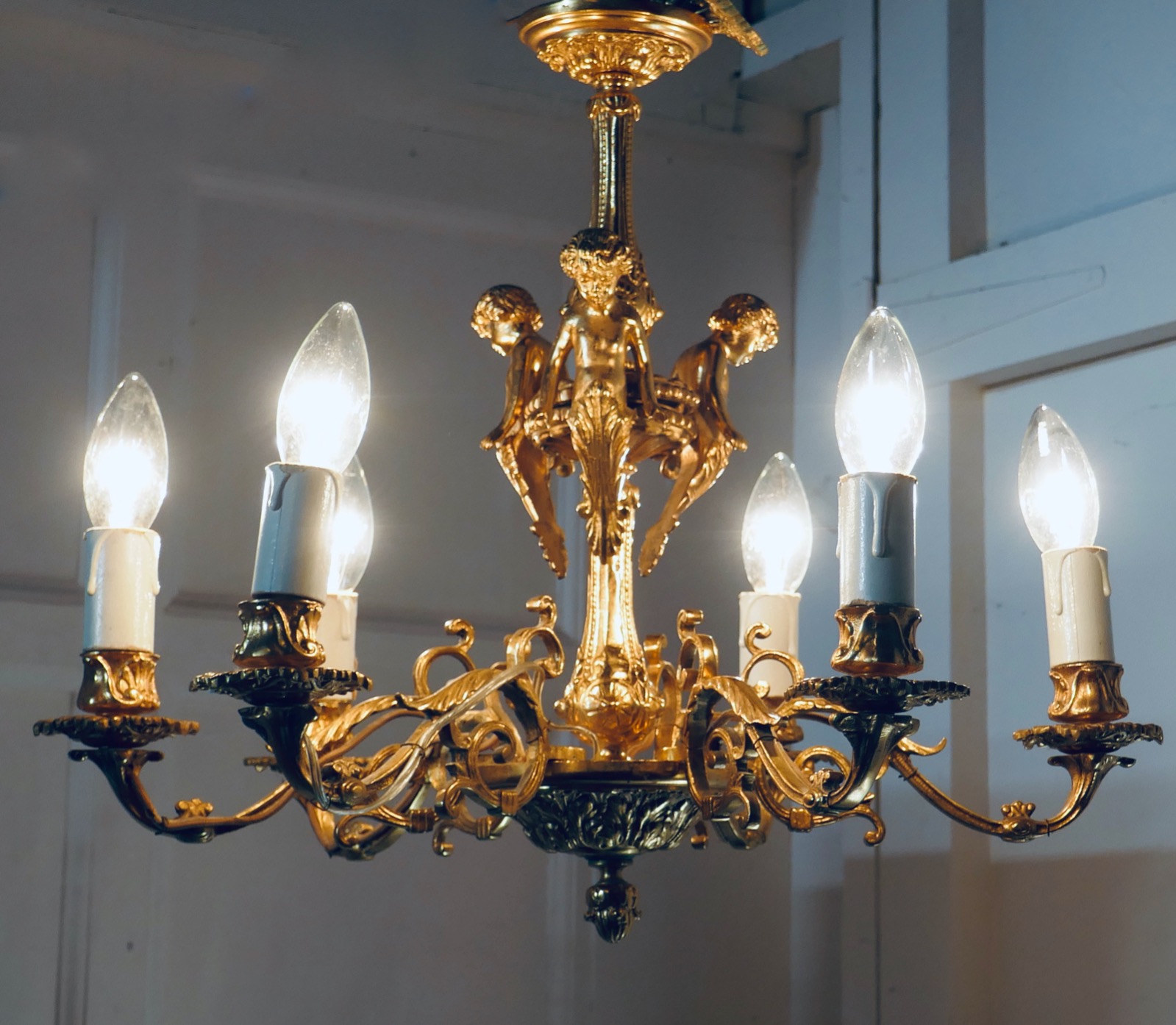 French Gilded Brass 6 Branch Rococo Cherub Chandelier