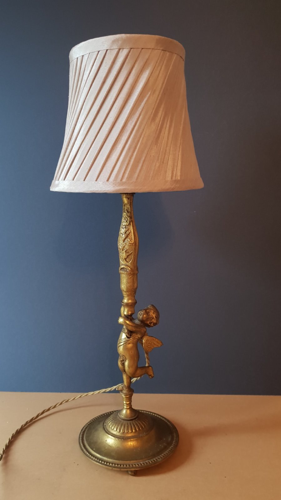 French Gilded Brass Cherub Table Lamp with Fabric Shade, Rewired & Pat Tested c.1890