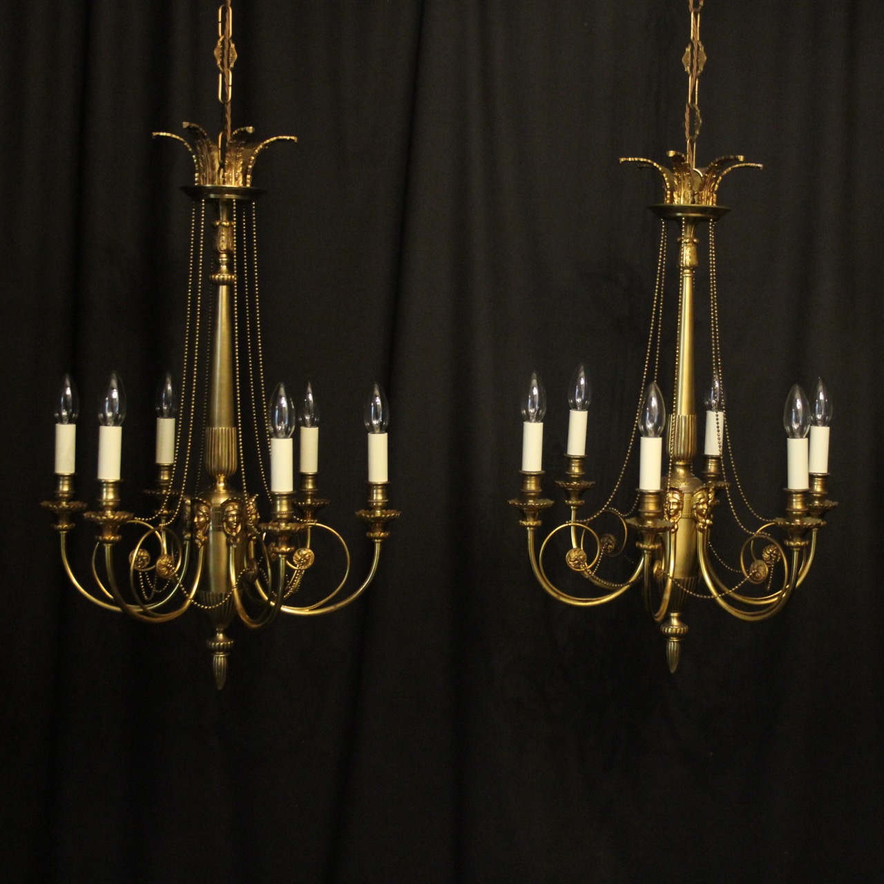 French Gilded Pair of 6 Light Antique Chandeliers