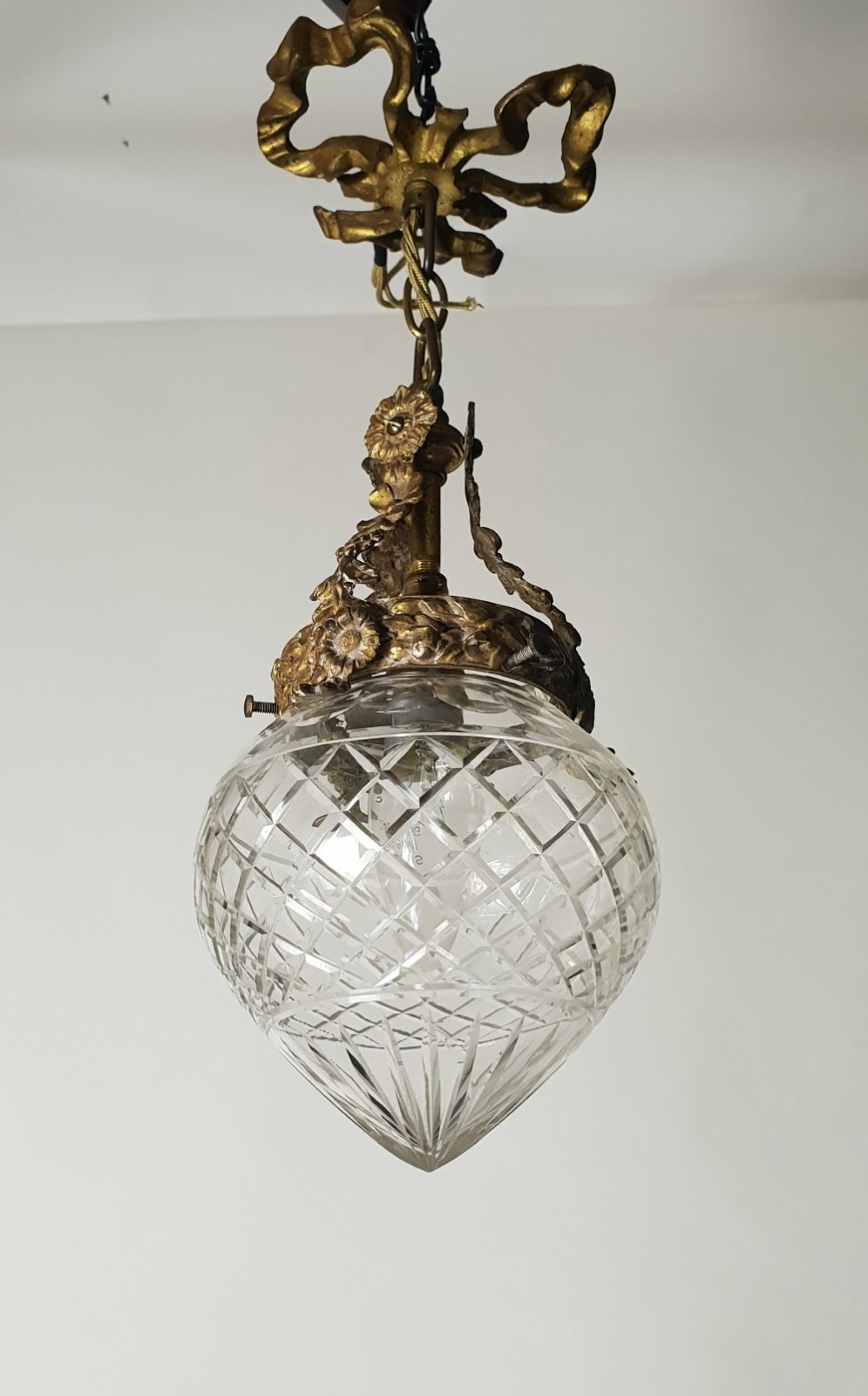 French Gilt Brass Original Ceiling Light with Cut Glass Shade, Rewired