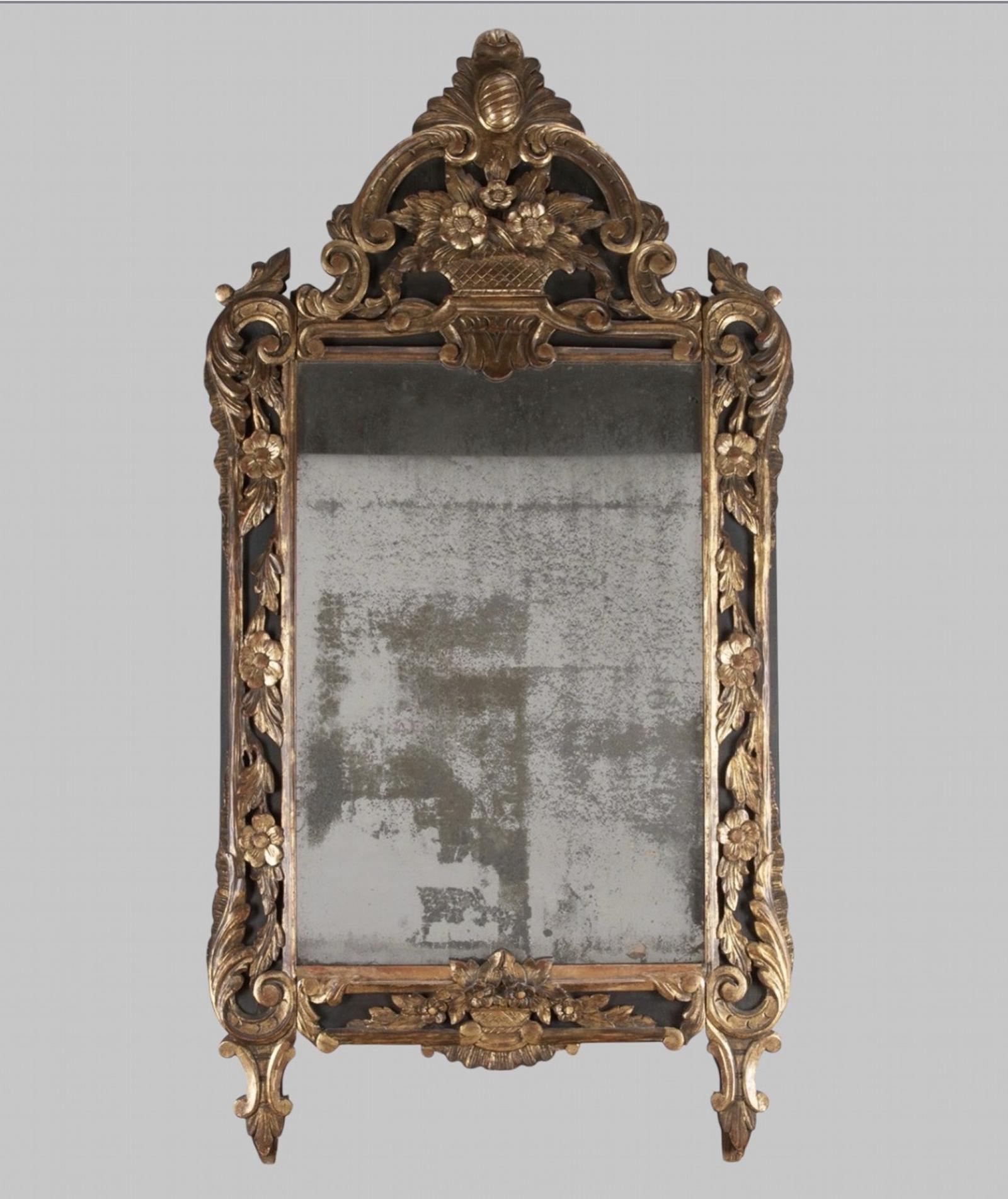 A very attractive French 18th Century antique gilt and ebonised mirror which has its original mirror plate that is foxed commensurate with age. A lovely piece with wooden back and old newspaper pinned to it.