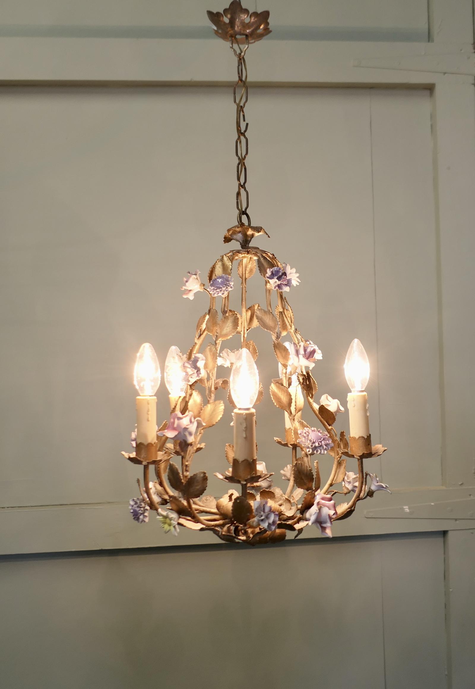 This French Gilt Toleware and Floral Ceramic 6 Branch Chandelier is located in United Kingdom