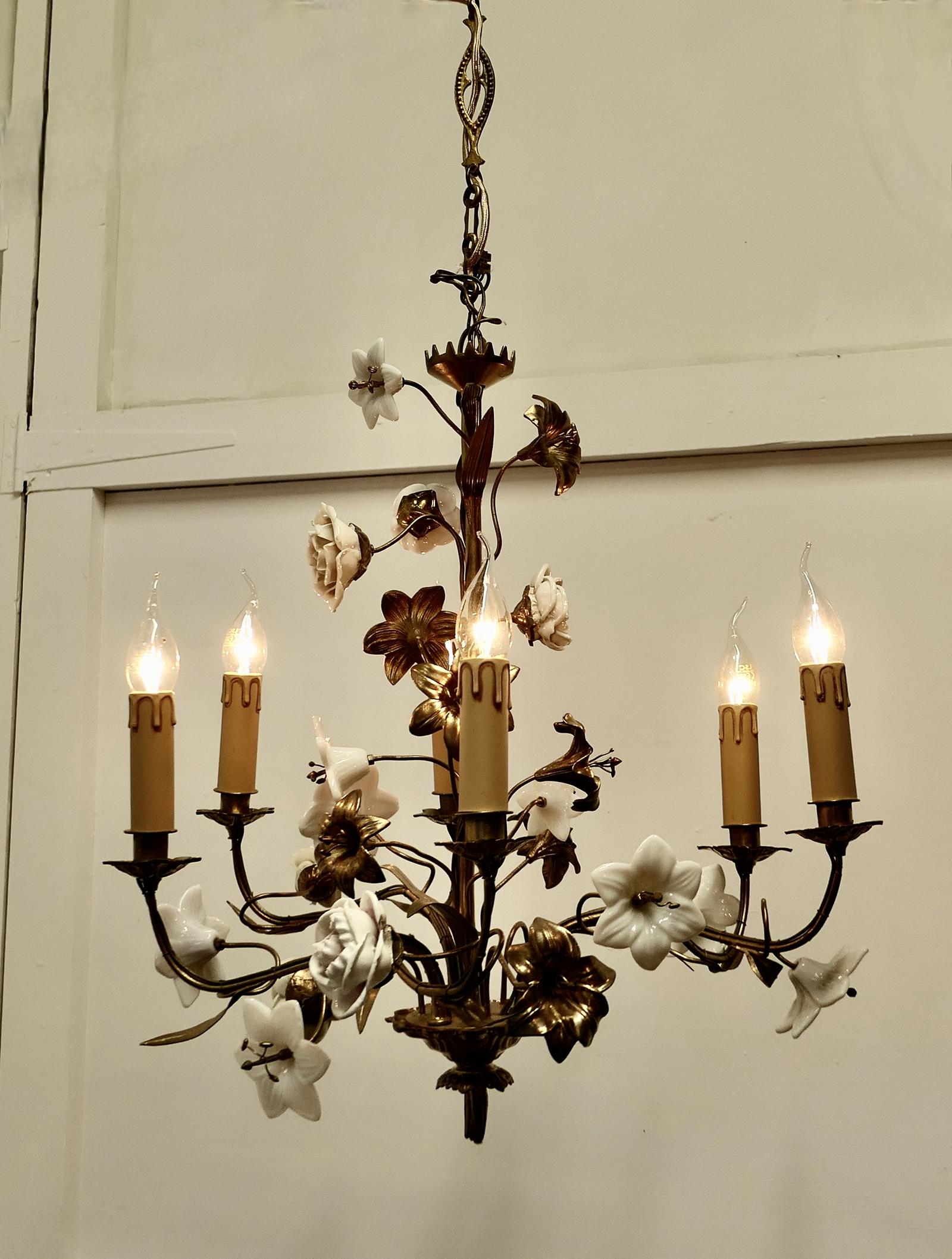 French Gilt Toleware & Floral Ceramic 6 Branch Chandelier