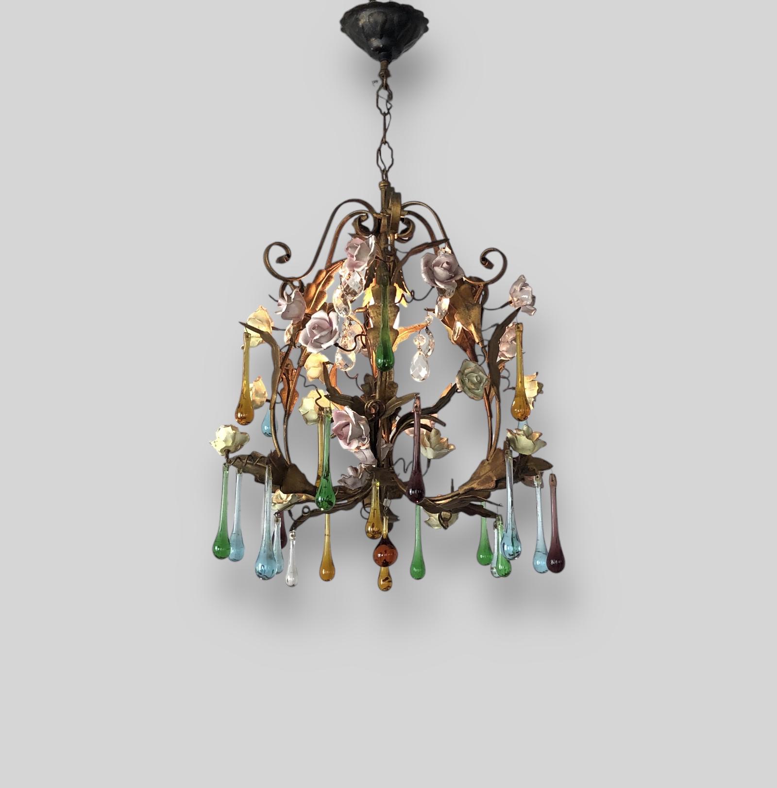 French Gilt Toleware Floral Chandelier Ceiling Light