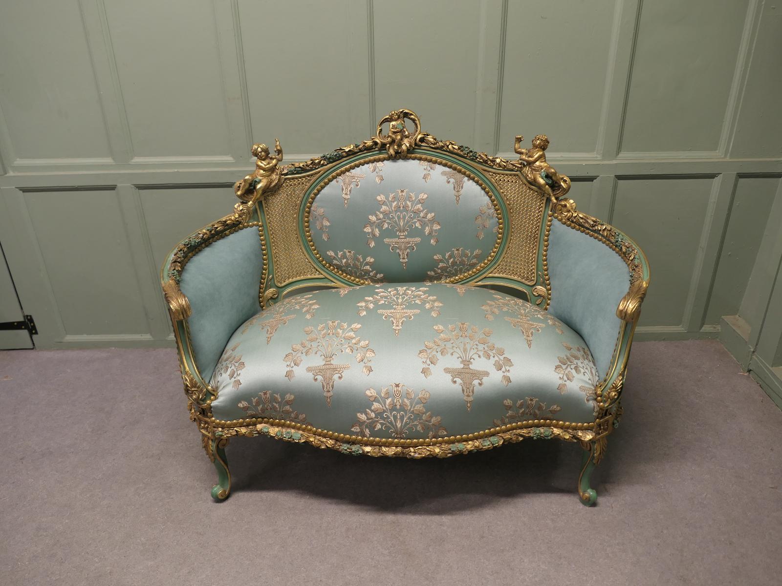 This Stunning French Sofa is in the Rococo style and is decorated with cherubs along the top, the settee is just large enough for 2, it has a curved back with an oval silk panel set in bergère and the padded arms wrap around the well stuffed seat