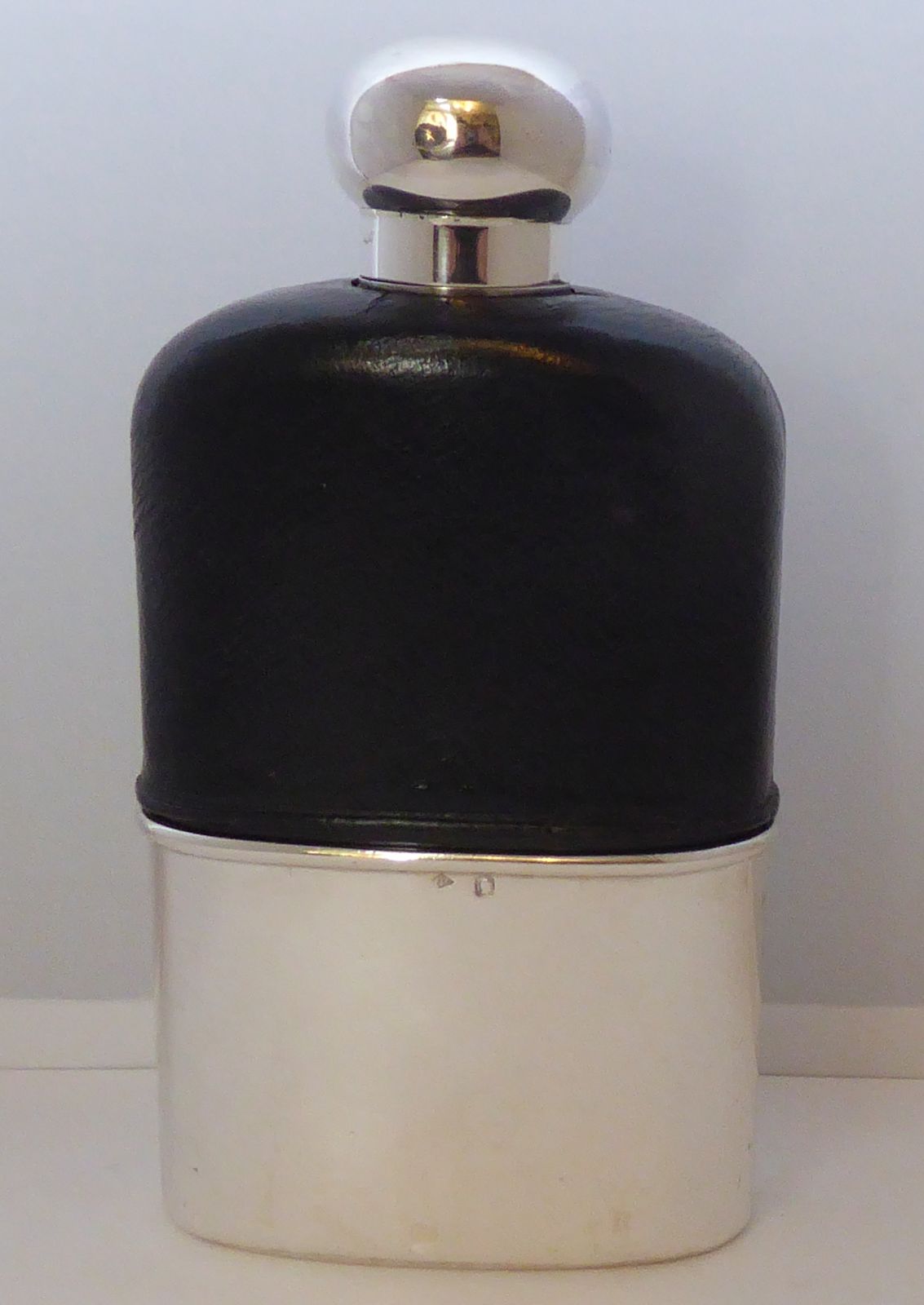 French Gustave Keller Solid Hallmarked Silver Leather Bound Hip Flask c.1900