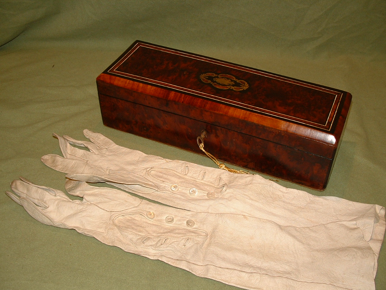French Inlaid Amboyna Glove Box with Long Leather Gloves C.1870