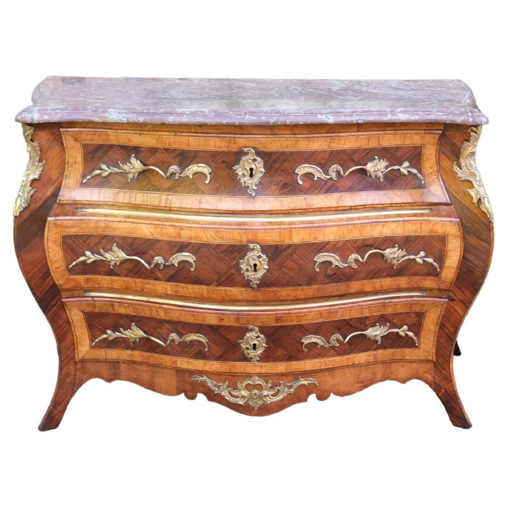 Hutton-Clarke Antiques is delighted to present a superb 18th century French Louis XV commode, masterfully crafted from tulip wood, walnut, and rosewood. This exceptional piece features Bombay-style curved ends adorned with exquisite diamond-shaped parquetry. Each drawer is equipped with original gilt hardware, enhanced by parquet-style designs and elegant inlays. Uniquely, the commode is accented with concave brass strips between the drawers and ornate mounts atop the legs. The commode boasts a continuous elegant shape, crowned with its original, thick marble top. The marble is beautifully figured in a porphyry style, with grey veining over a terracotta base colour characteristic of the period. The drawer linings, made from high-quality pine and poplar, remain in their original condition, as does the back of the commode. An exquisite addition to both modern and traditional interiors, this commode is a testament to the craftsmanship and style of its era.