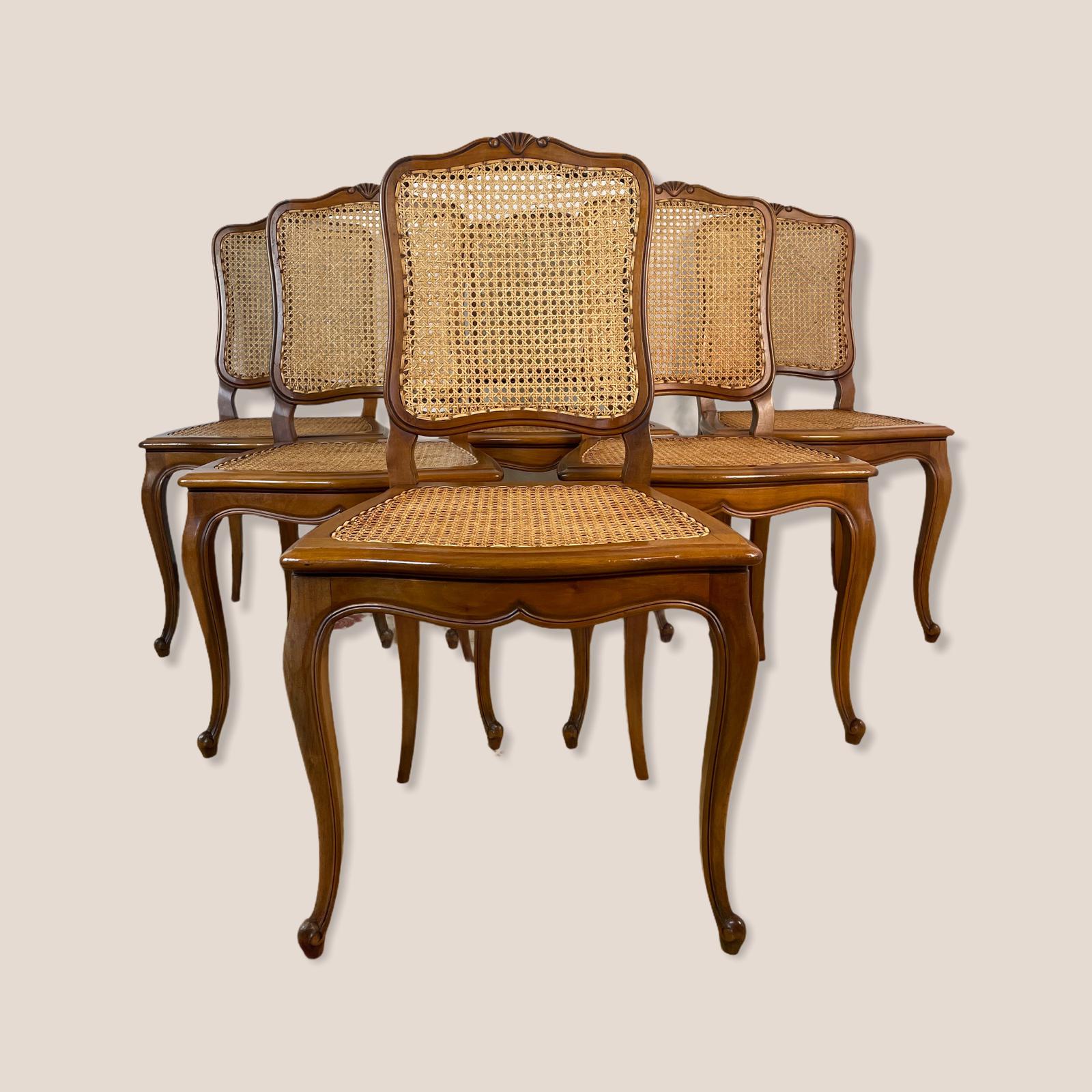 French Louis Style Set Of 6 Cherry Wood Bergère Cane Dining Chairs
