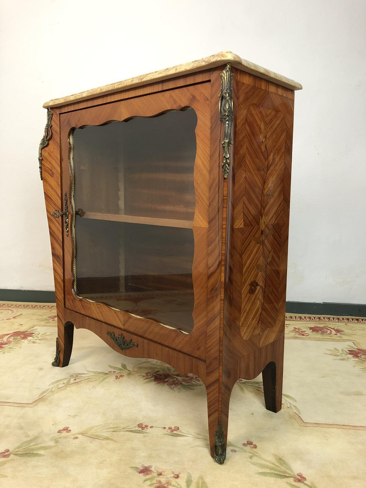 French Louis XV Style Glazed Vitrine Bookcase Marquetry Ormolu & Marble Top