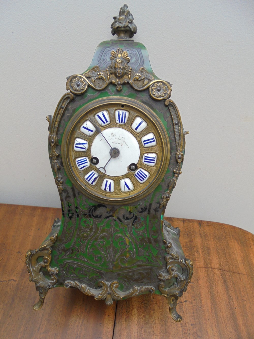 French Louis XV Style Green Tortoiseshell Boulle Mantel Clock
