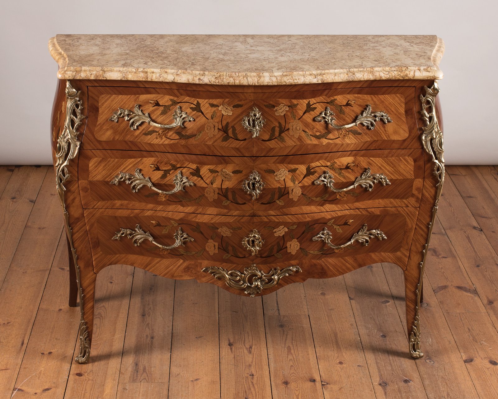 French Louis XV Style Three Drawer Marquetry Chest of Drawers (1 of 1)