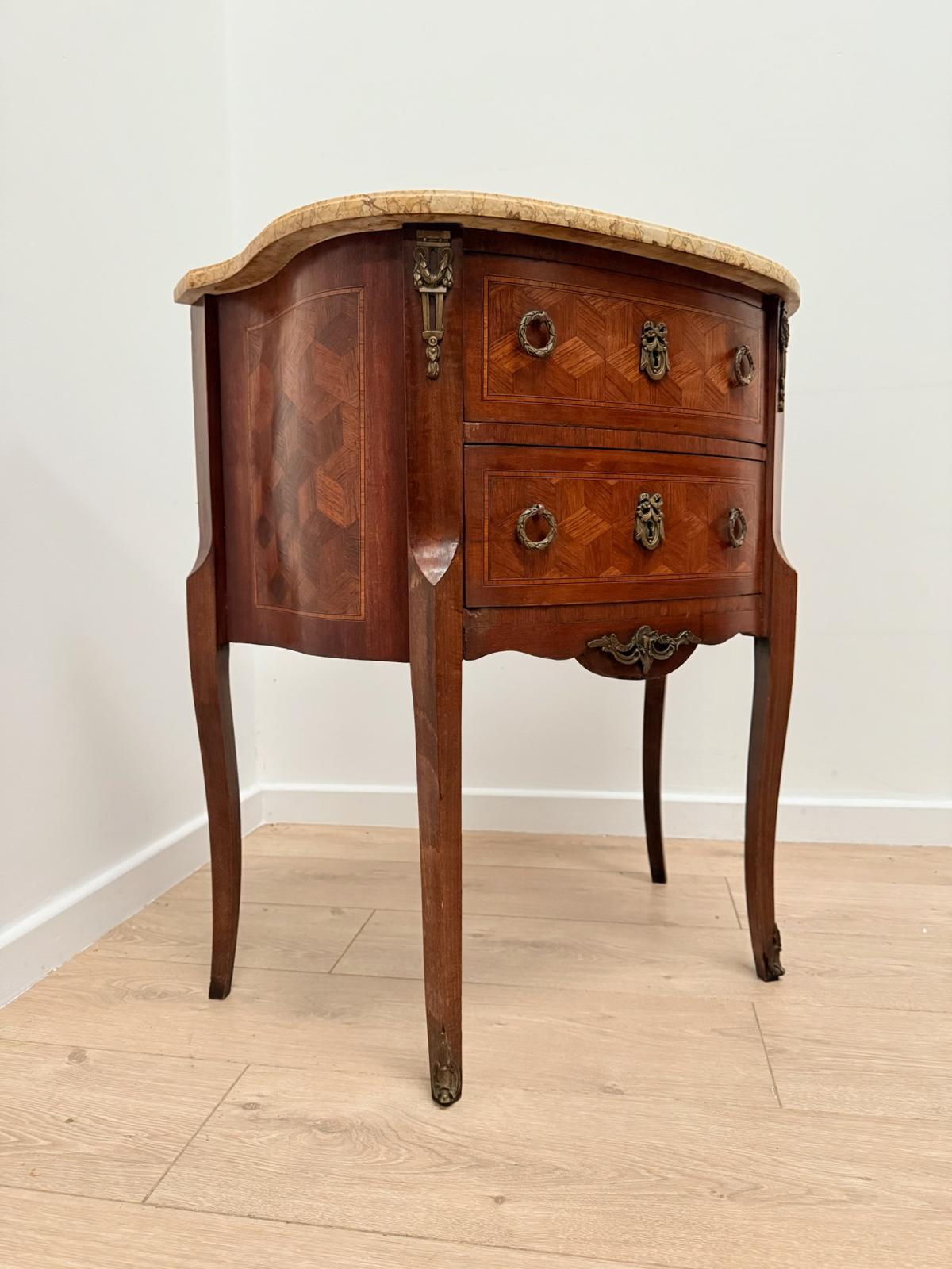 Add a touch of elegance to your bedroom with these beautiful French Louis XV Tulip wood marquetry chest of drawers. The intricate tulipwood marquetry design adds a stunning antique finish to the chest, which is fully assembled and made with high-quality materials. The chest feature Ormolu mounts and brass decorative handles. This chest is perfect for any room and is ideal for indoor use only. The shaped Breche d Alep marble tabletop material adds to the beauty and durability of the chest. Assembly is not required, and no additional parts are needed. All restoration is done sympathetically to keep authenticity. Please see delivery information regarding our sister specialist Antiques courier company.