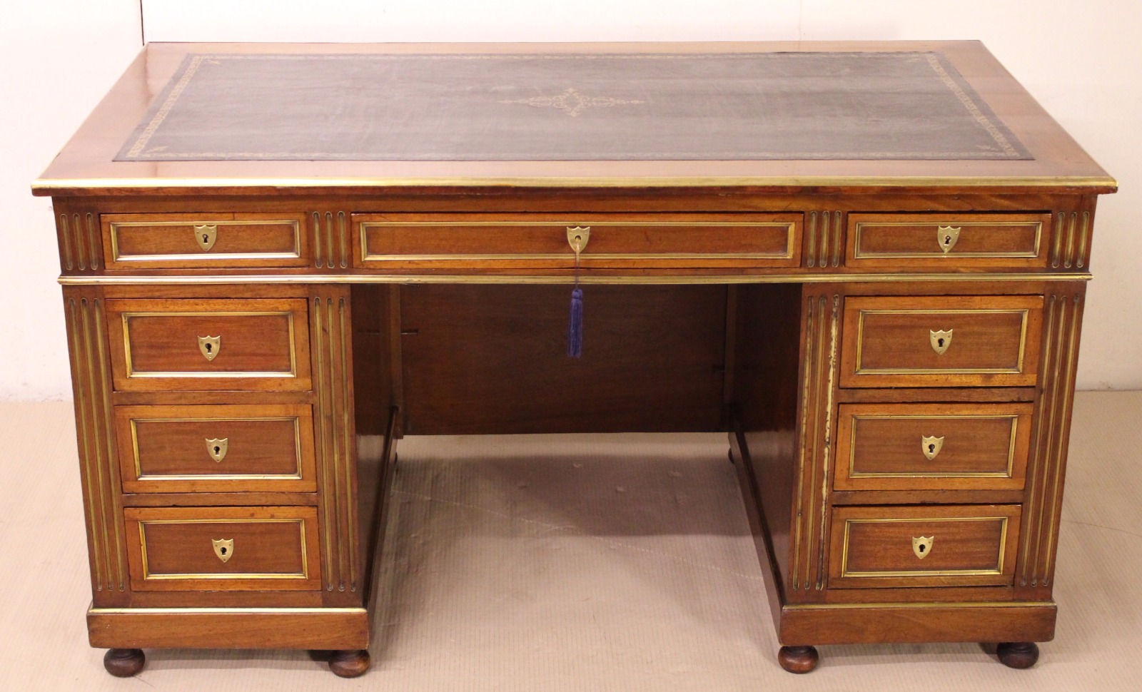 French Mahogany & Brass Inlaid Pedestal Desk