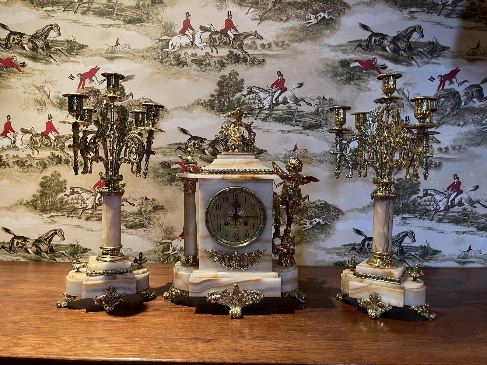 French Marble Mantlepiece Set with Clock & Candlesticks