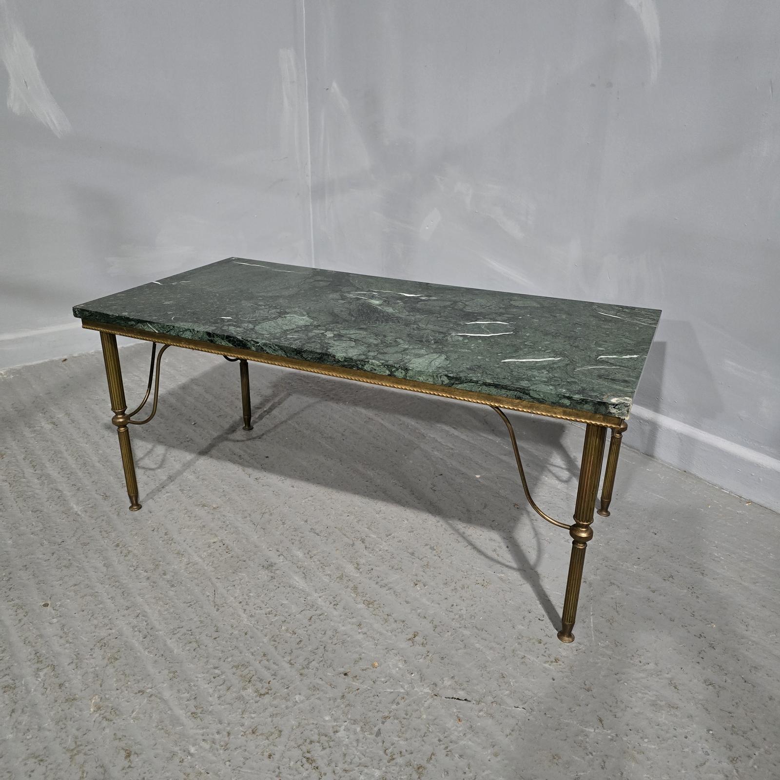 A very good French brass coffee table with green mottled marble top, in very good overall condition.