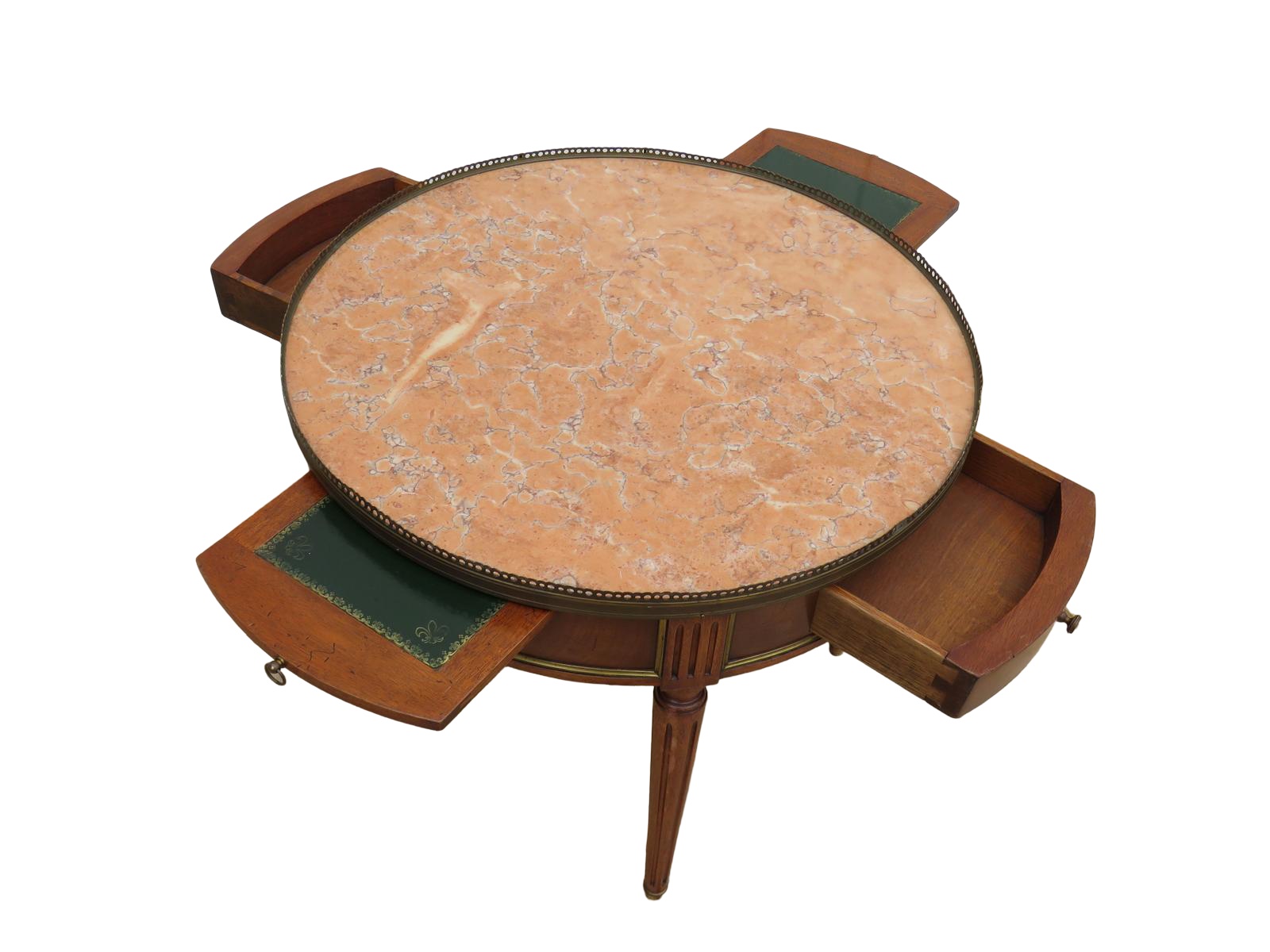 Shapely, sound and sturdy mid 20th century French marble top and mahogany gueridon, bouillotte, side, coffee, games table with pierced brass top gallery and two drawers and two candle slides.