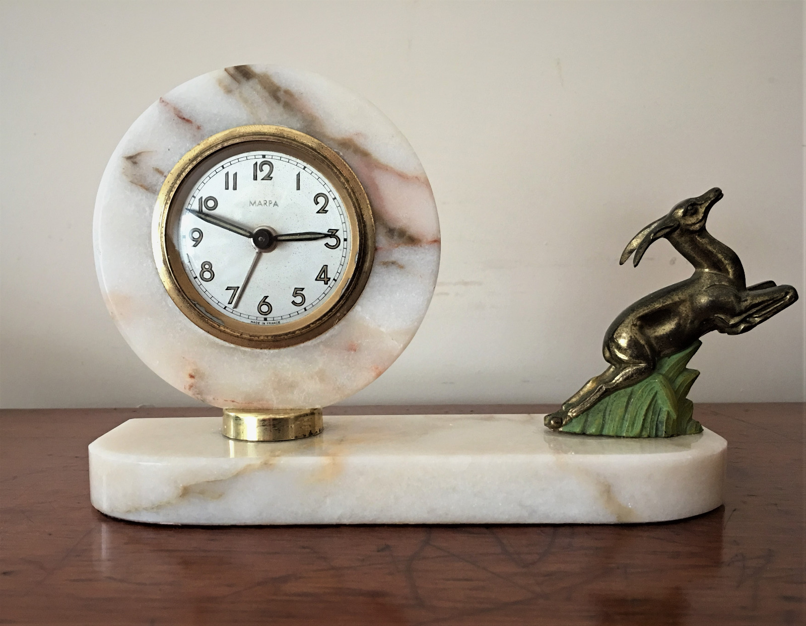 French ‘Marpa’ Art Deco Marble Alarm Clock with Leaping Gazelle
