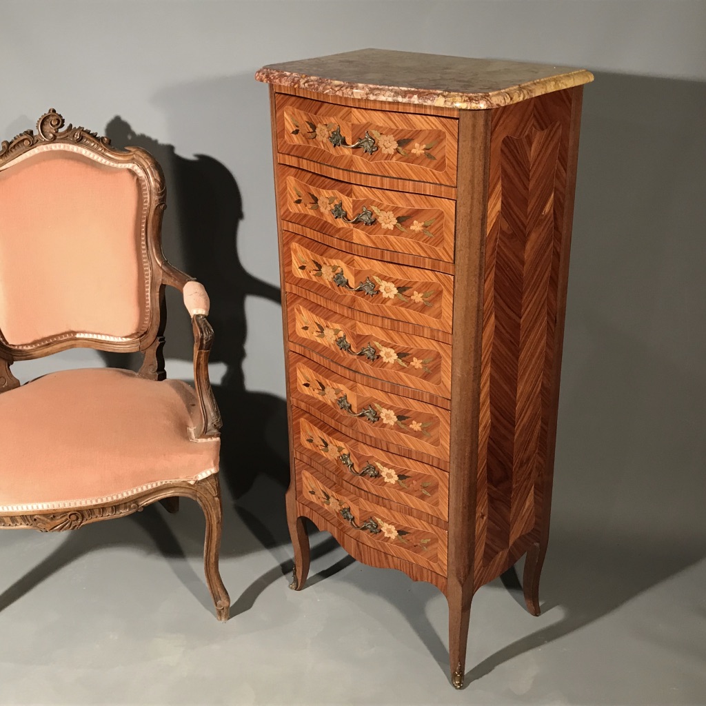 French Marquetry 7 Drawer Chest with Marble Top c.1920