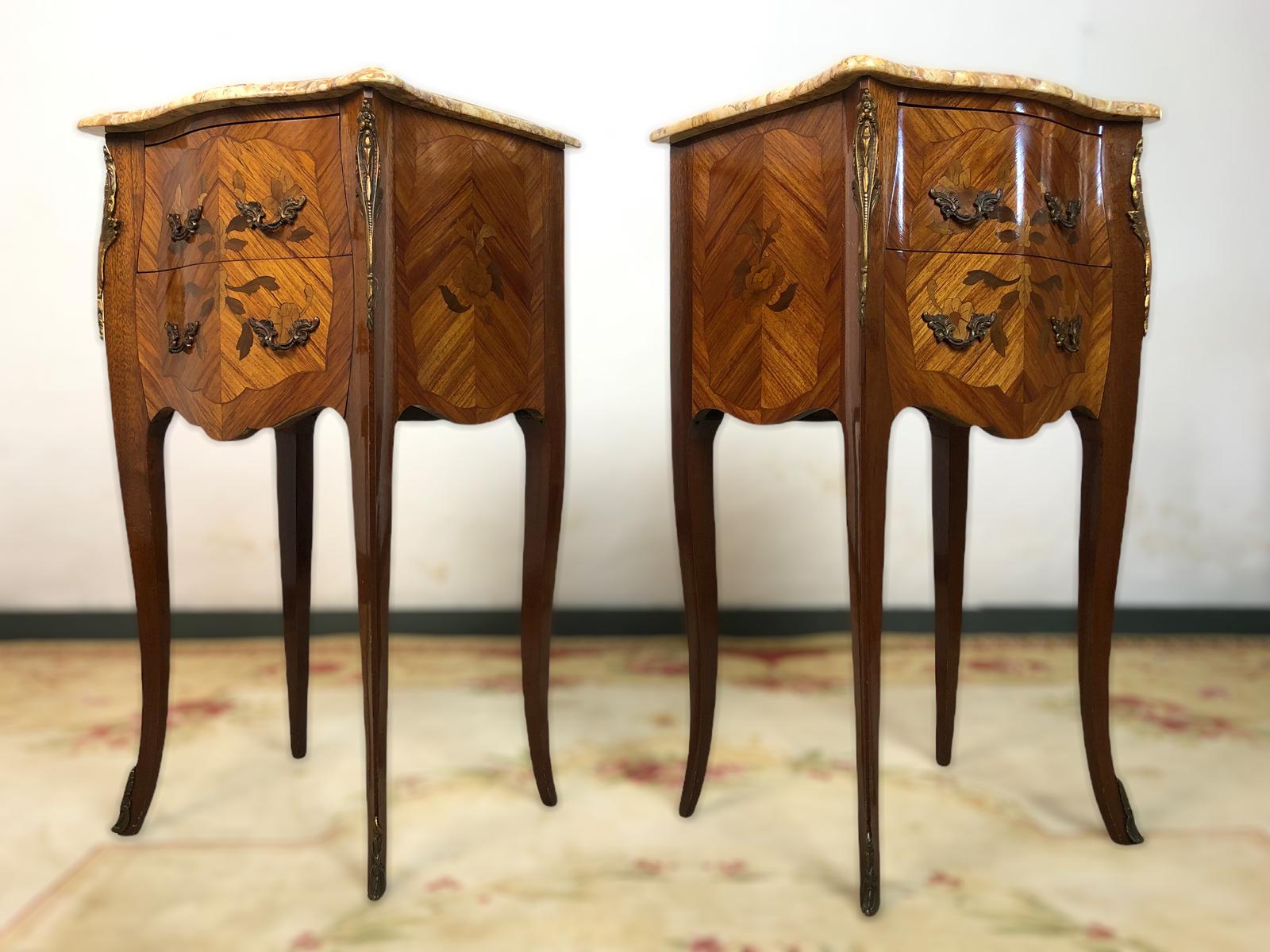 French Marquetry Bedside Cabinets Louis XVI Style with Marble Tops