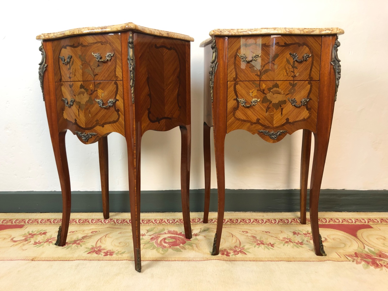 French Marquetry Bedside Cabinets with Marble Tops Louis XV Bombe Style