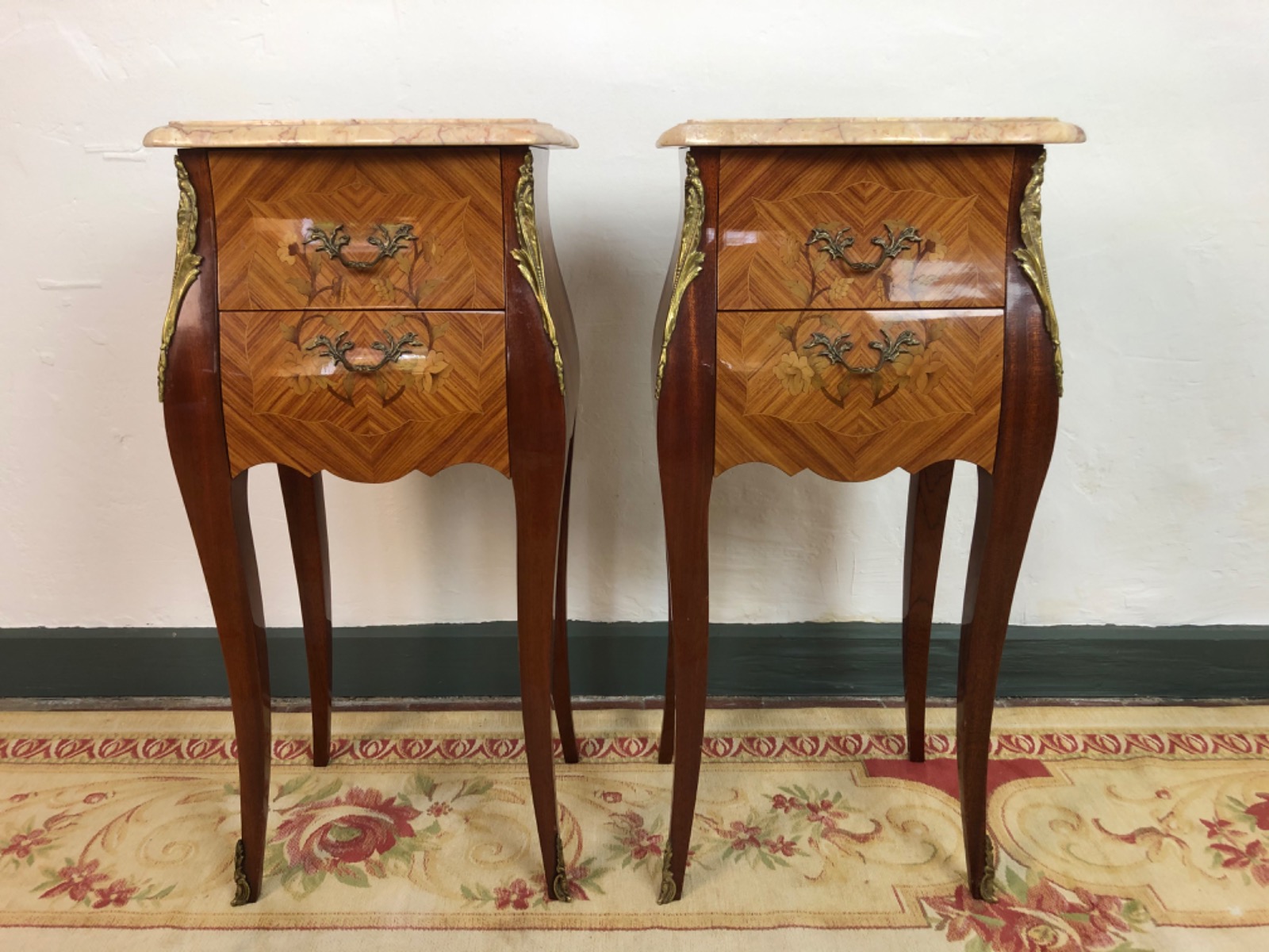 French Marquetry Bedside Tables Cabinets with Marble Tops Louis XV Bombe Style