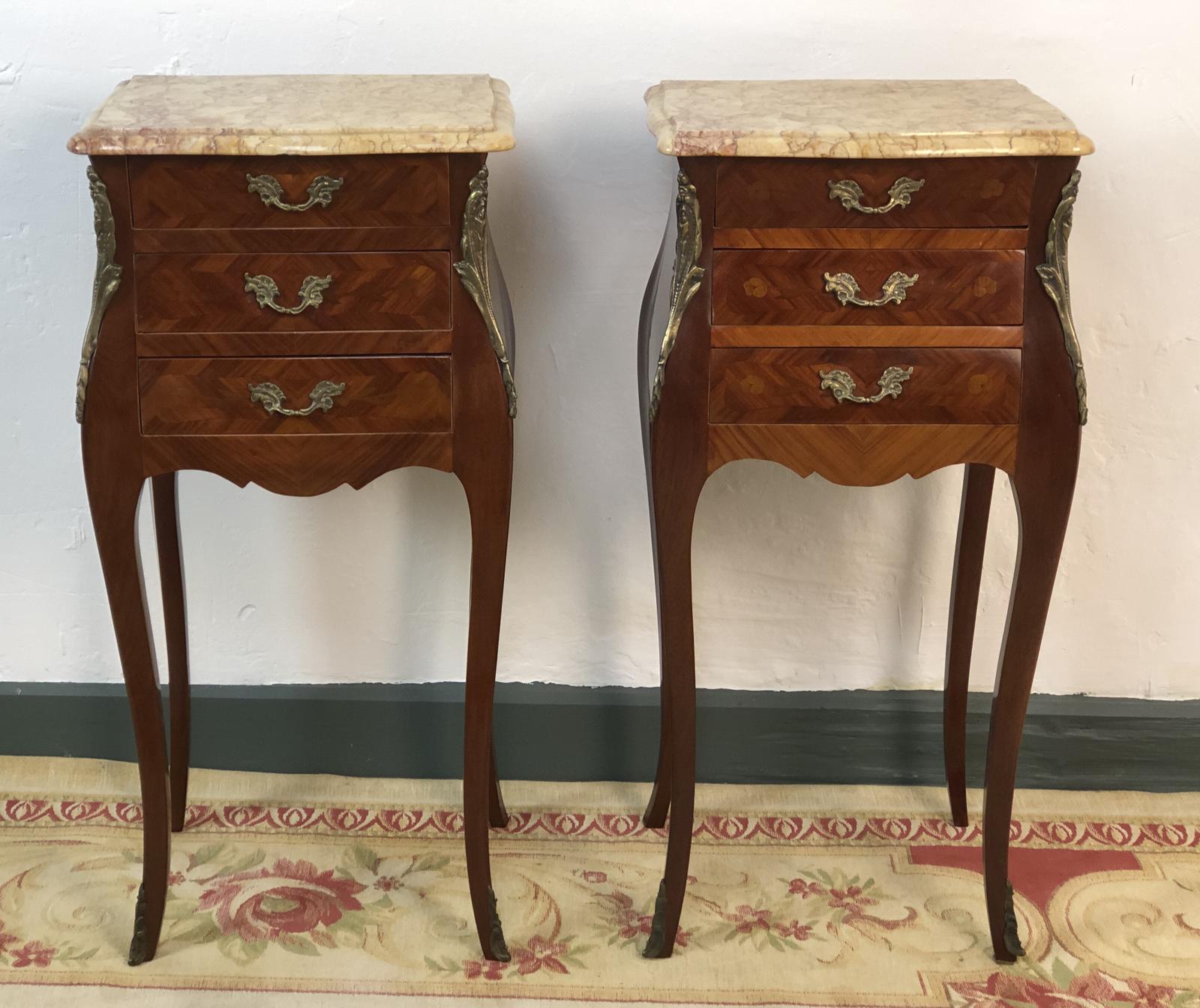 French Marquetry Bedside Tables Cabinets With Marble Top’s Louis XV Bombe Style