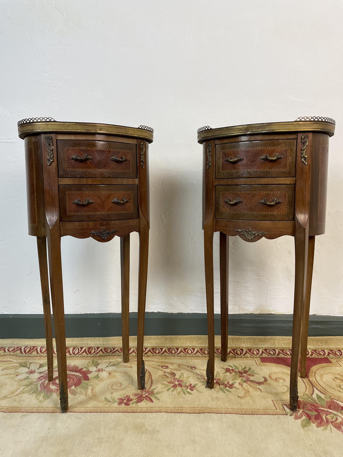 French Marquetry Bedside Tables Oval Cabinets with Marble Tops