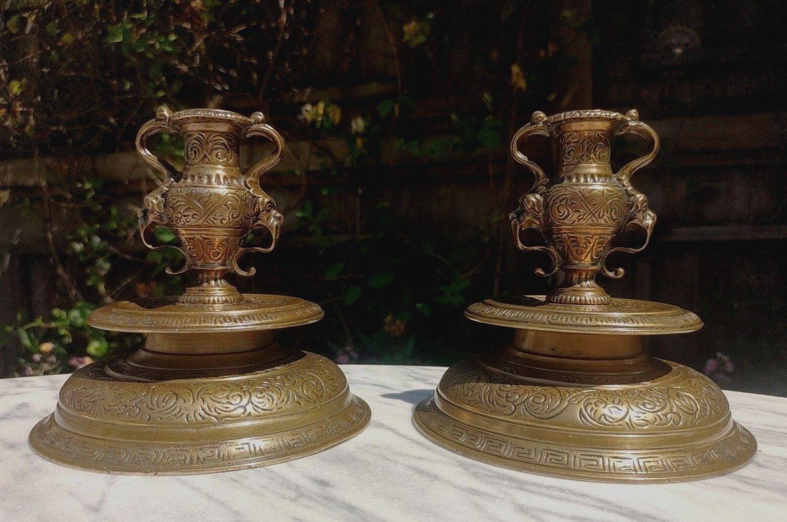 French Neoclassical Renaissance Style 19th Century Bronze Urn Candlestick Holders