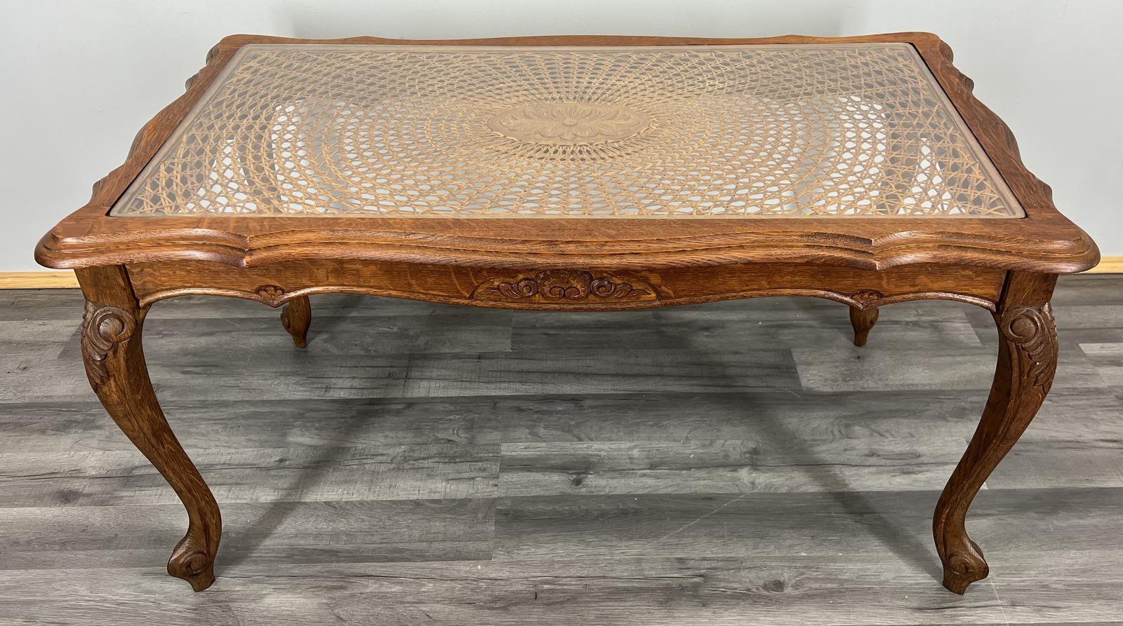 French Oak Coffee Table | Vintage Louis XV Cane Top Table with Glass (1 of 13)