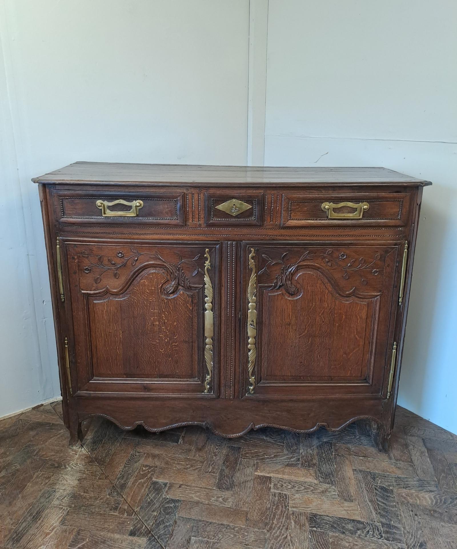 This elegant French carved oak buffet is a charming example of provincial craftsmanship. It features a beautifully aged patina and a warm, rich colour that highlights the natural grain of the wood. Narrow in proportion, it is ideally suited for use in a hallway, dining room, or smaller space where elegance and practicality are both desired.
