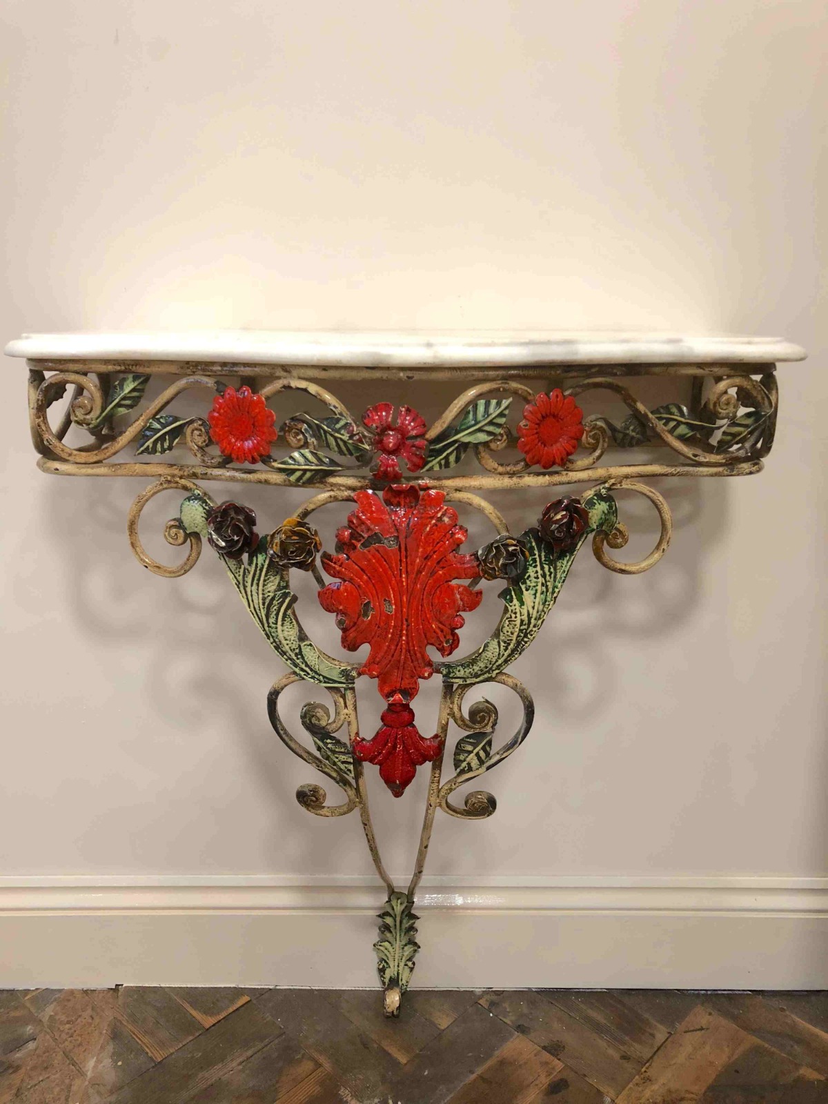 French Ornate Iron Console Table or Hall Table with Marble Top & Floral Decoration