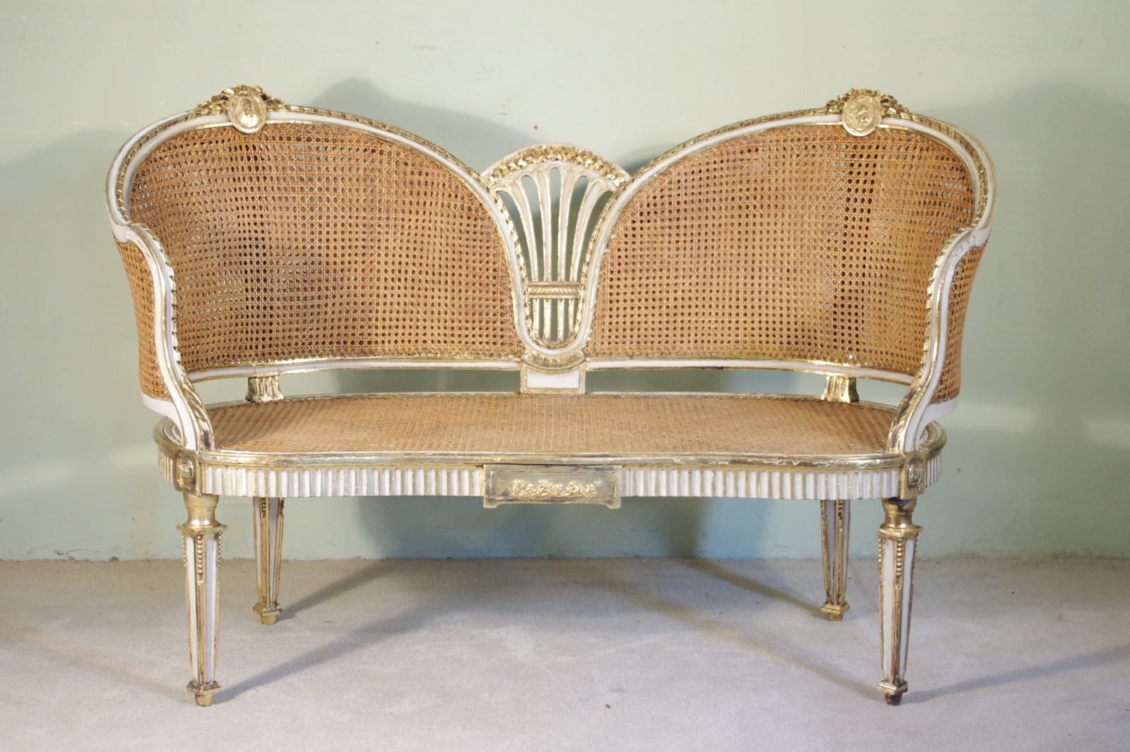 French Painted & Parcel-Gilt Two Seater Cane Sofa