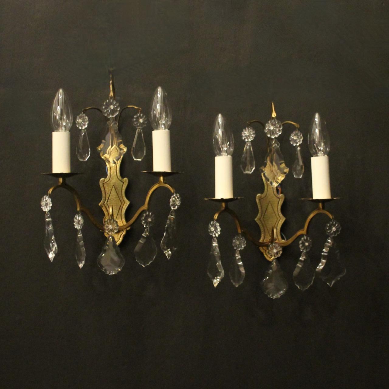 A French pair of gilded brass and crystal twin arm antique wall lights, the square gauge scrolling arms with leaf bobeche drip pans, issuing from a leaf backplate with scrolling wirework canopy and decorated overall with French Slab crystal faceted pendants. Fully rewired and PAT tested. All our wall lights come with aged brass screws for fixing and spare bulbs.