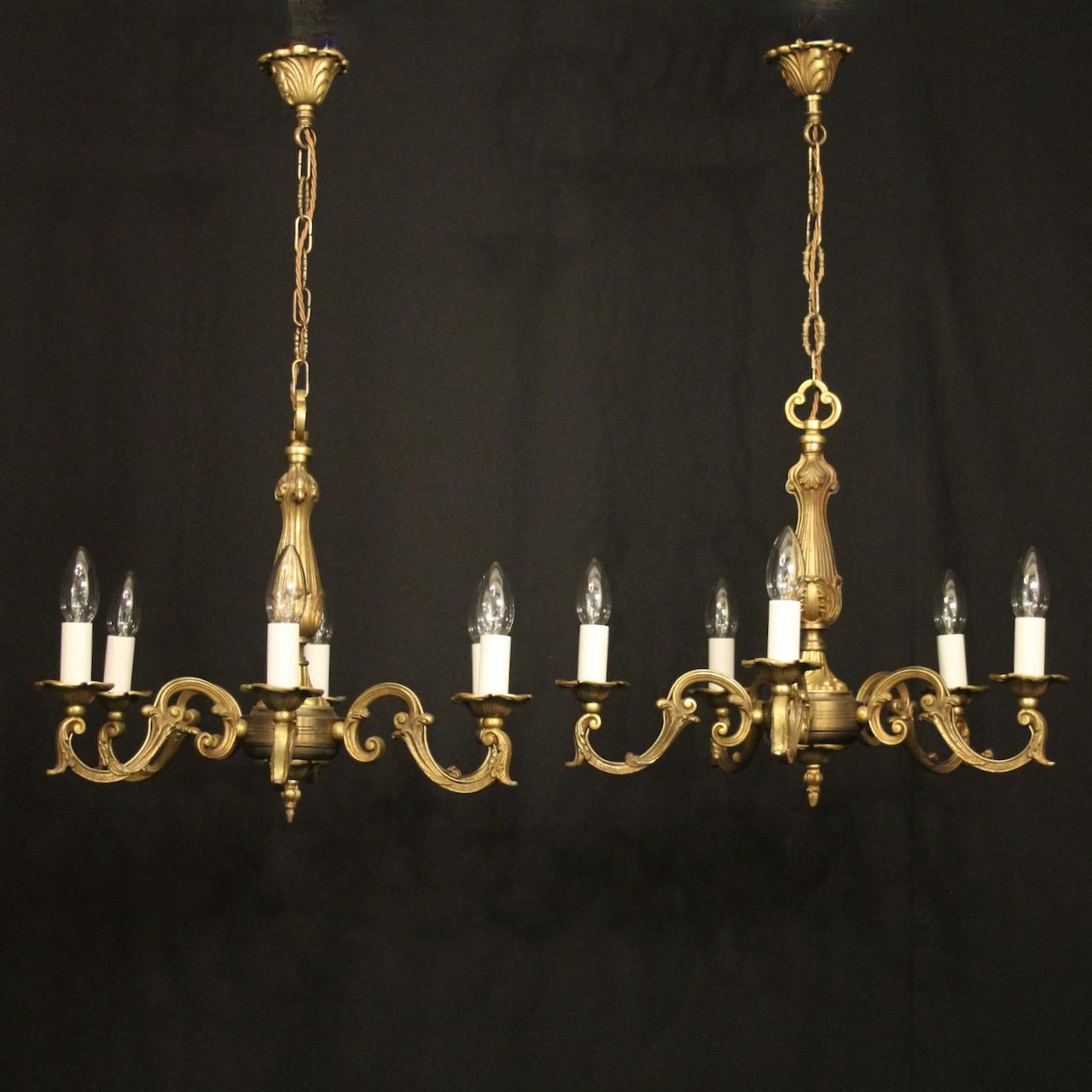 French Pair of 5 & 6 Light Gilded Chandeliers