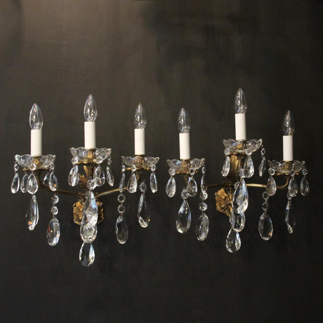 French Pair of Bronze & Crystal Triple Arm Wall Lights