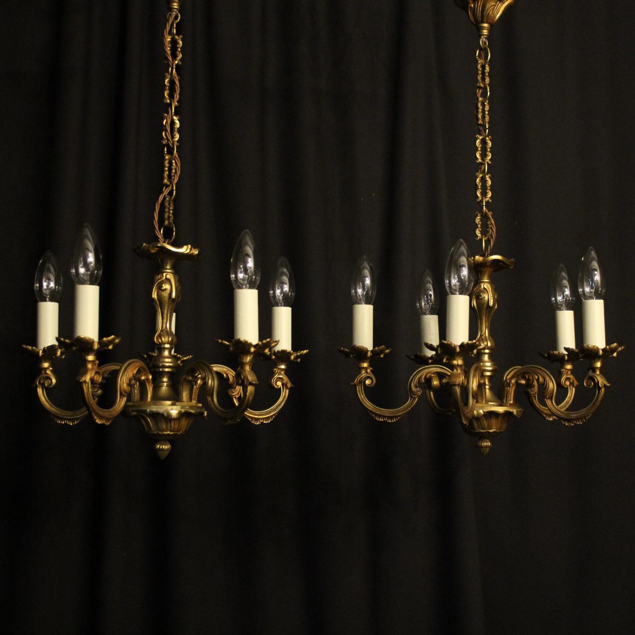 French Pair of Gilded 5 Light Antique Chandeliers