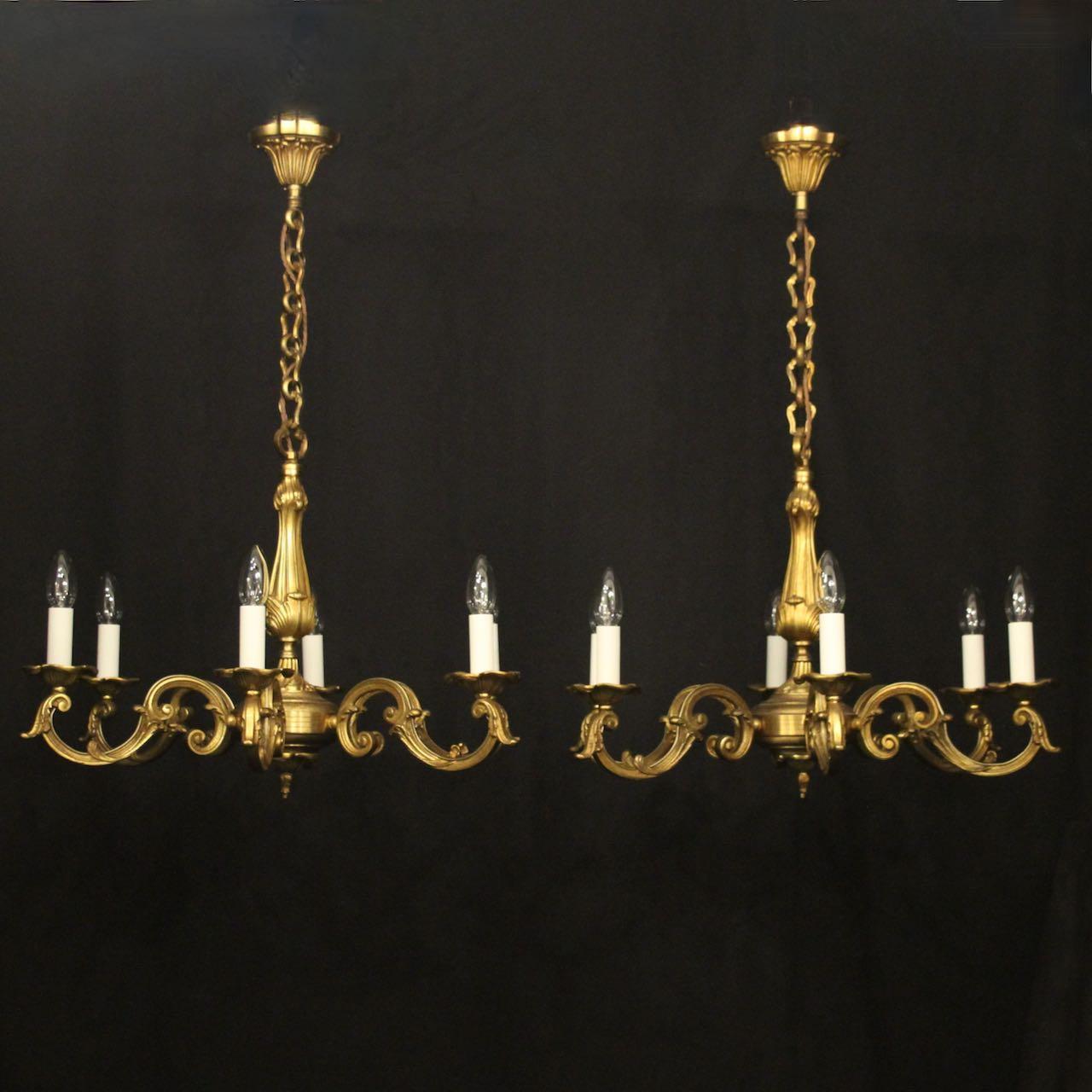 French Pair of Gilded Bronze 6 Light Chandeliers