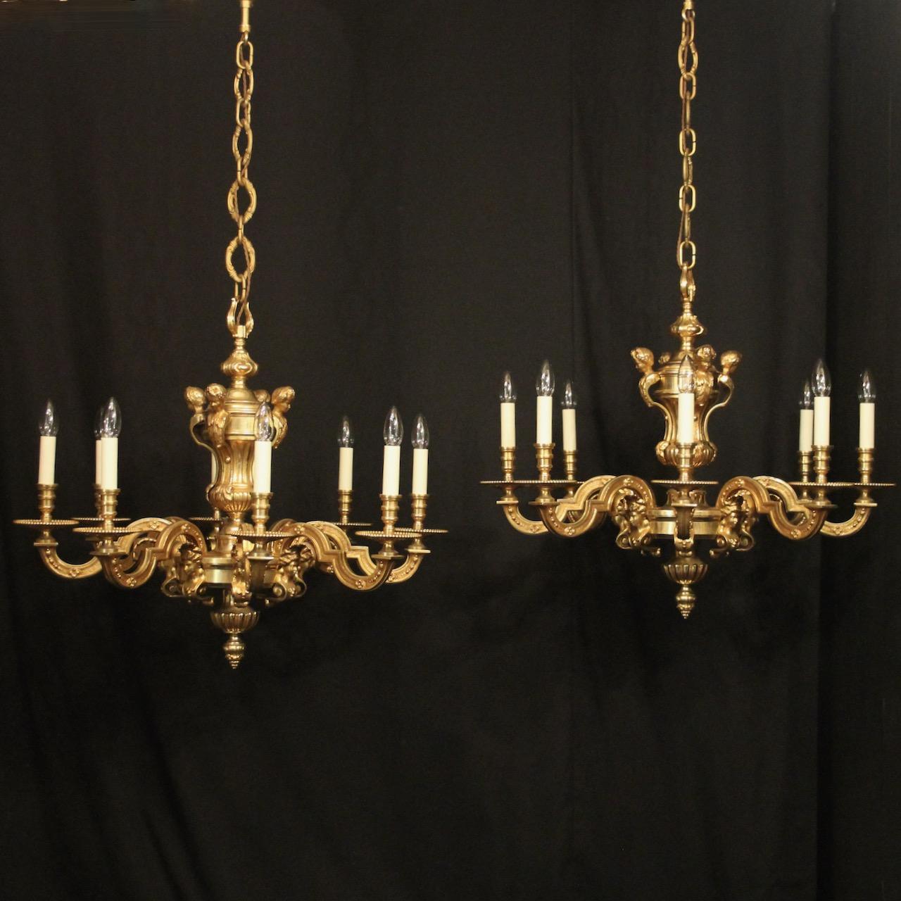 French Pair of Gilded Bronze 8 Light Chandeliers