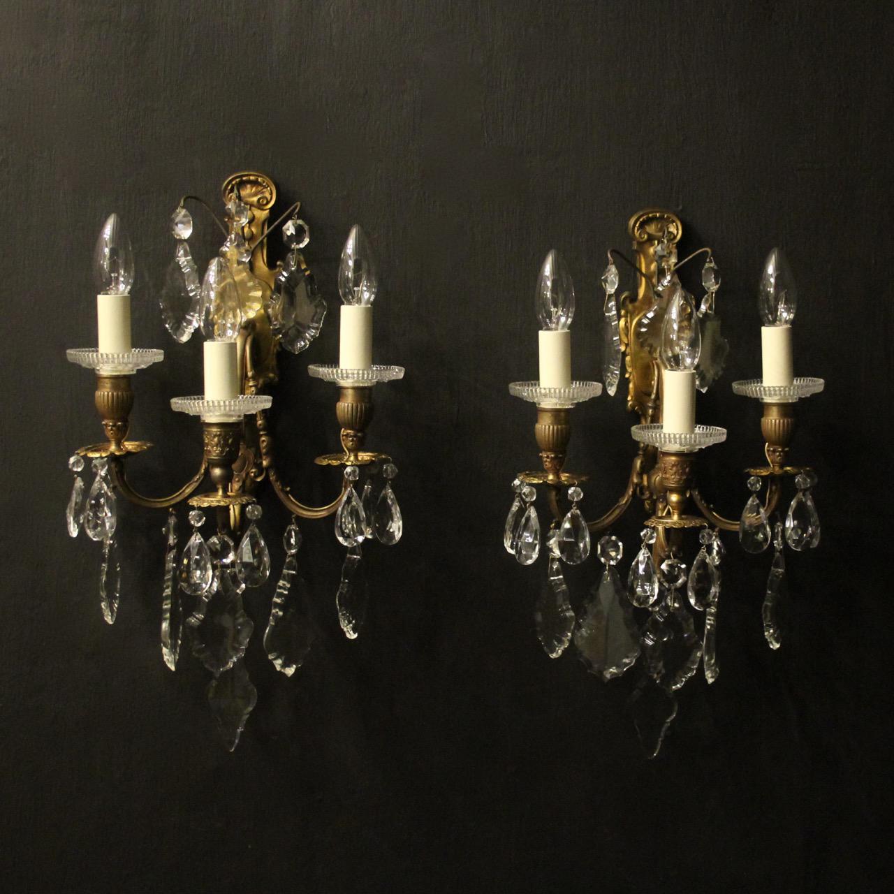 French Pair of Gilded Bronze & Crystal Sconces