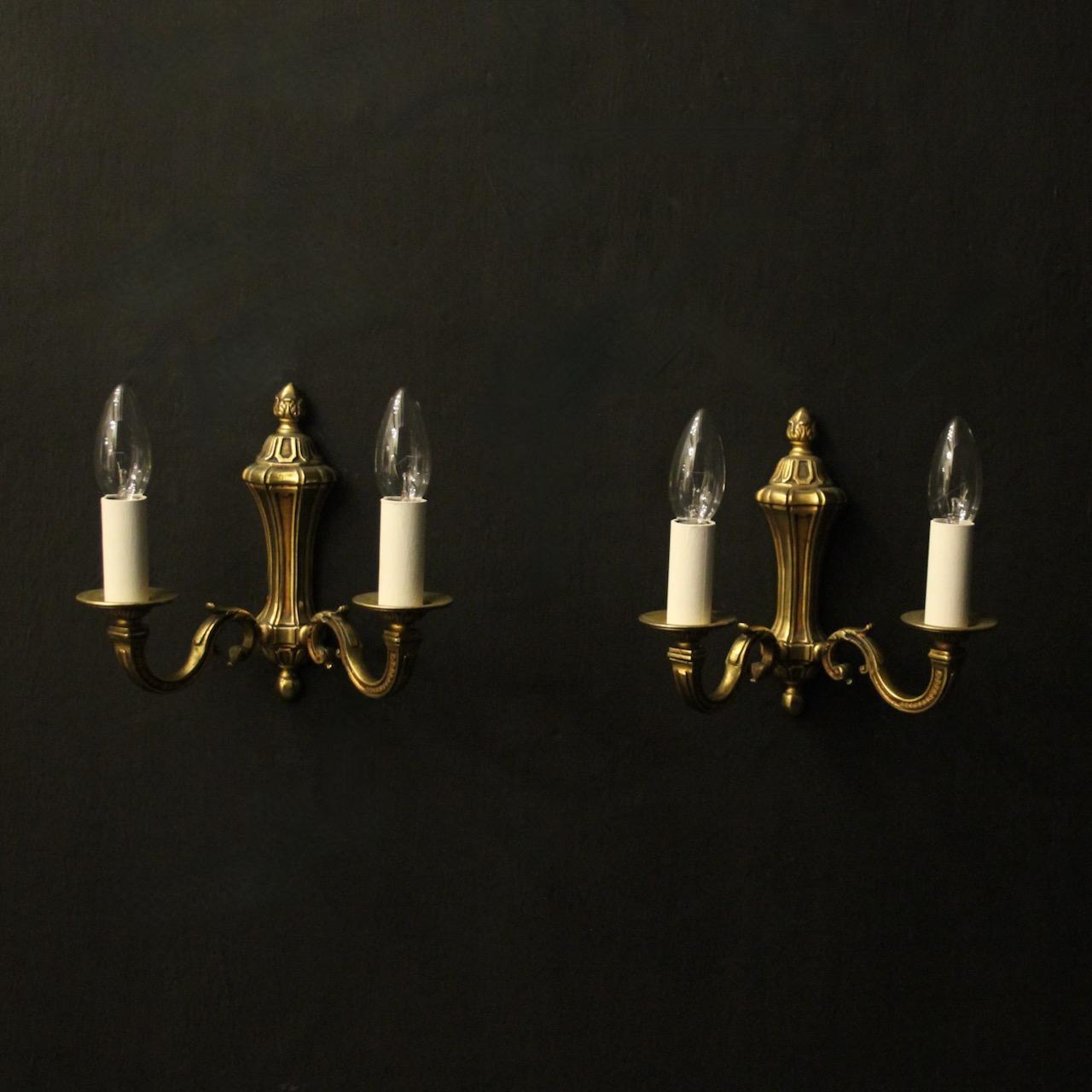 A small French pair of gilded bronze twin arm wall lights, the tapering scrolling square gauge arms with circular leaf bobeche drip pans, issuing from a reeded tapering backplate with acorn finial, nice crisp gilded patination.