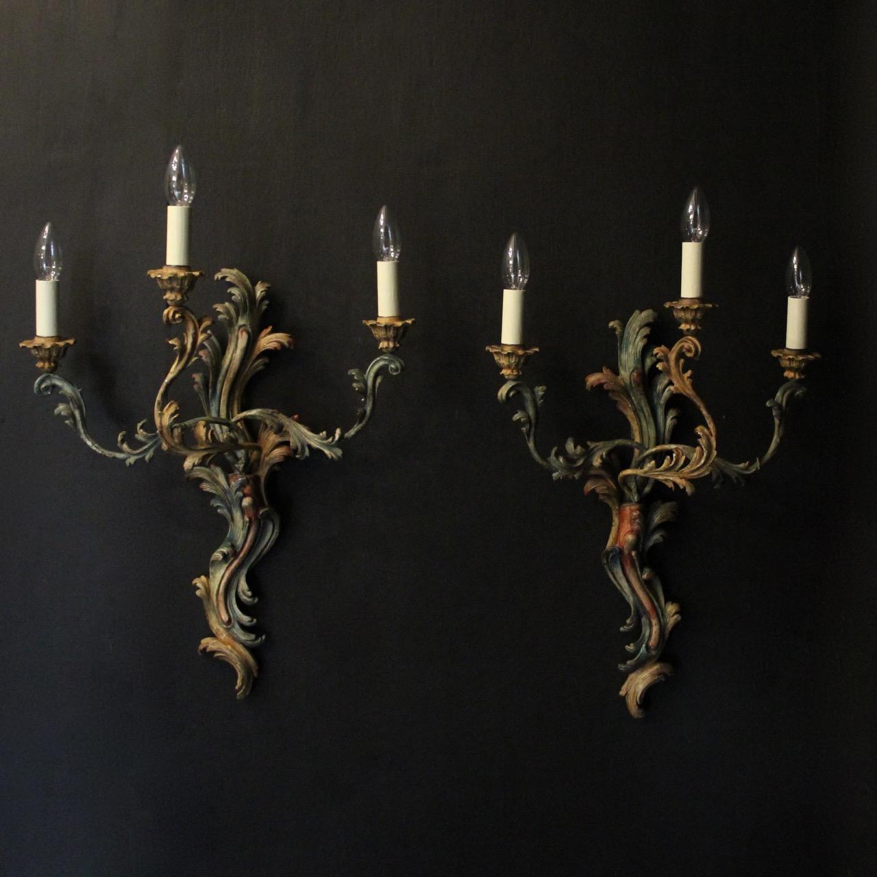 French Pair of Polychrome Gilded Wall Lights