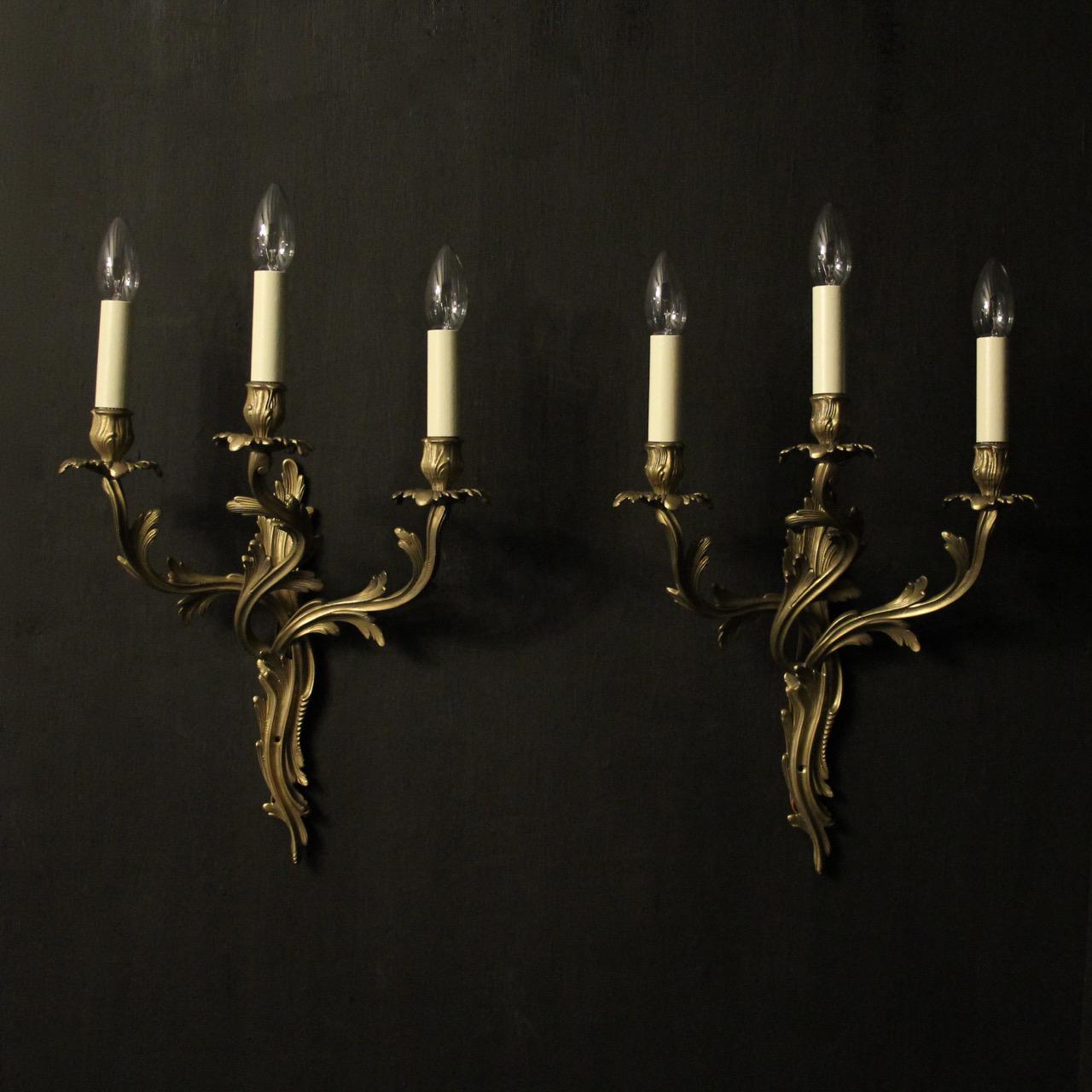 French Pair of Triple Arm Brass Wall Lights