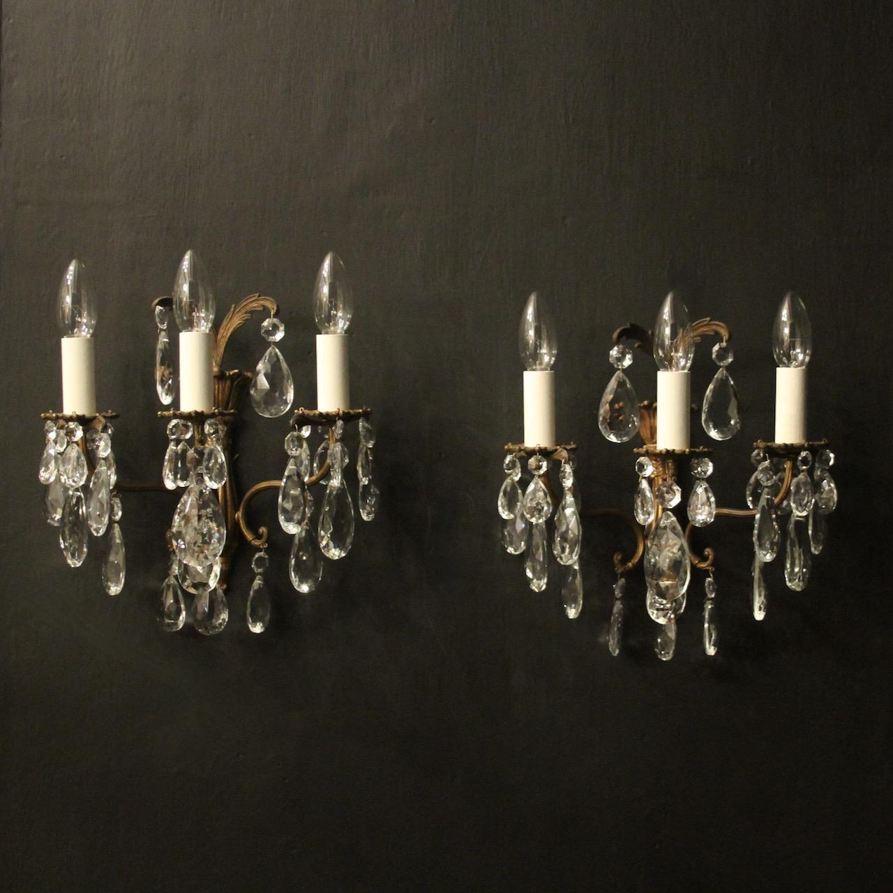 A French pair of gilded brass and crystal triple arm antique wall lights, the reeded scrolling arms with circular leaf bobeche drip pans, issuing from a reeded tapering backplate with leaf finial and decorated overall with crystal faceted pendants. Fully rewired and PAT tested. All our wall lights come with aged brass screws for fixing and spare bulbs.