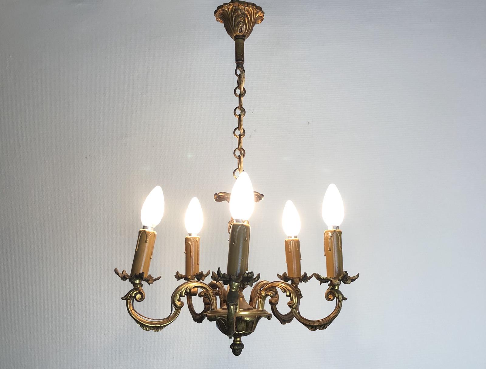 French Petite Gilt Bronze Chandelier 5 Arm Ceiling Light